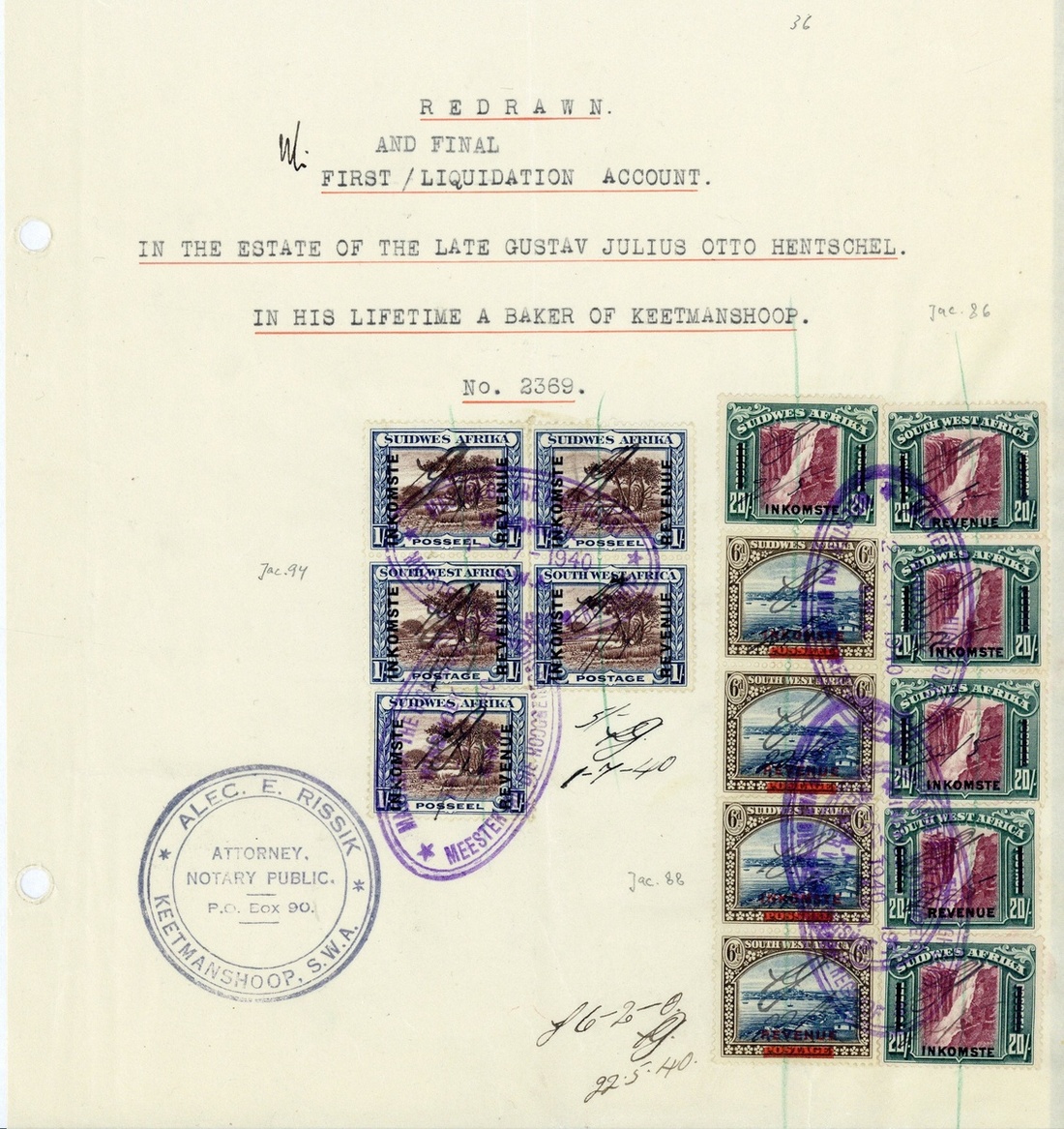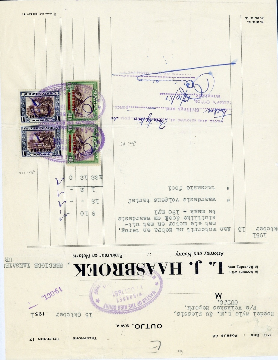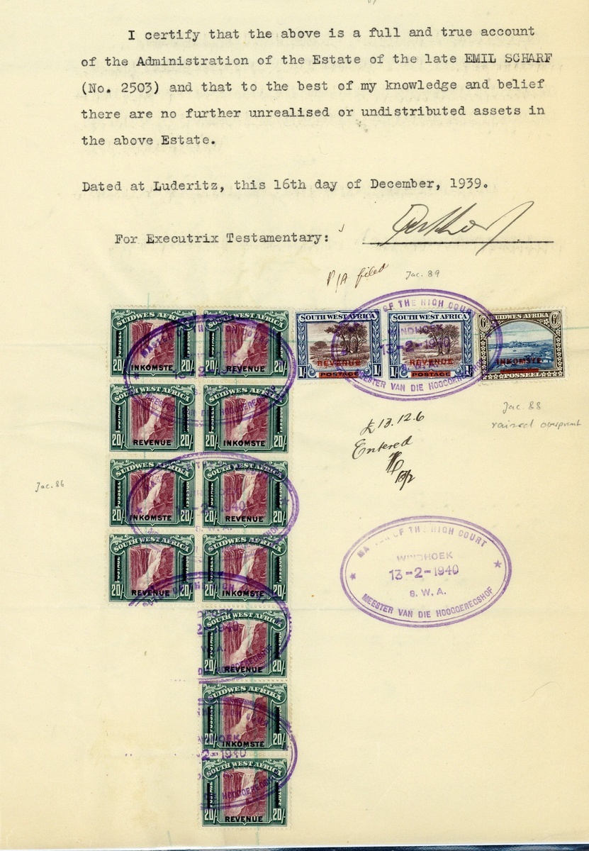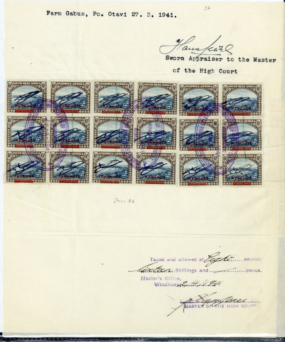 Group of document pages (10) variously franked including 1/- purple and purple (13) including bi-lingual pairs (5), 2/6d. green/orange, and 5/- grey and brown, (14) including block of nine, and a bi-lingual pair, showing a range of South West Africa overprints and settings. Fine.