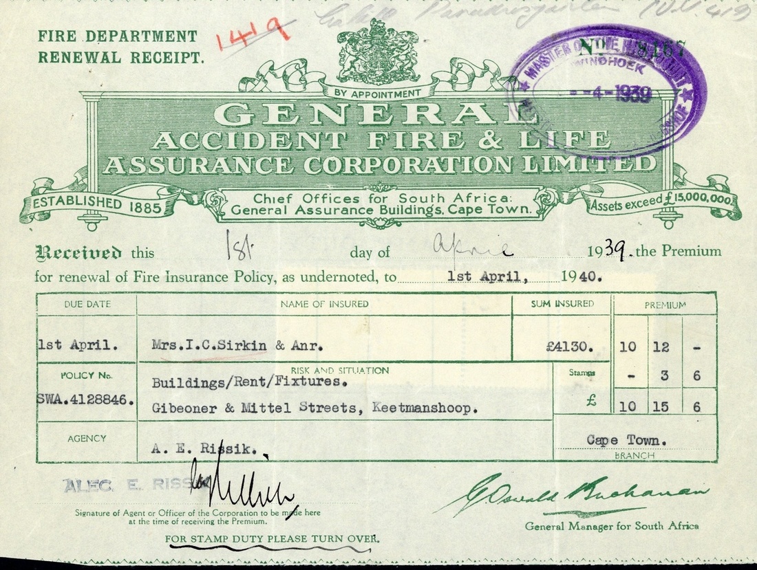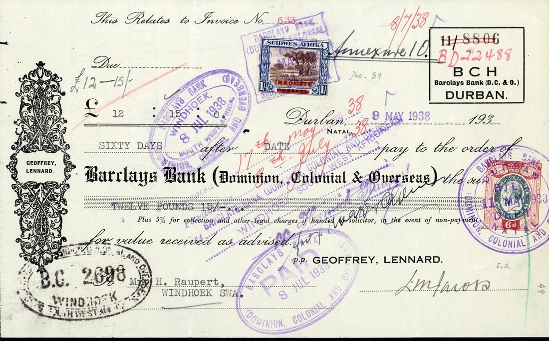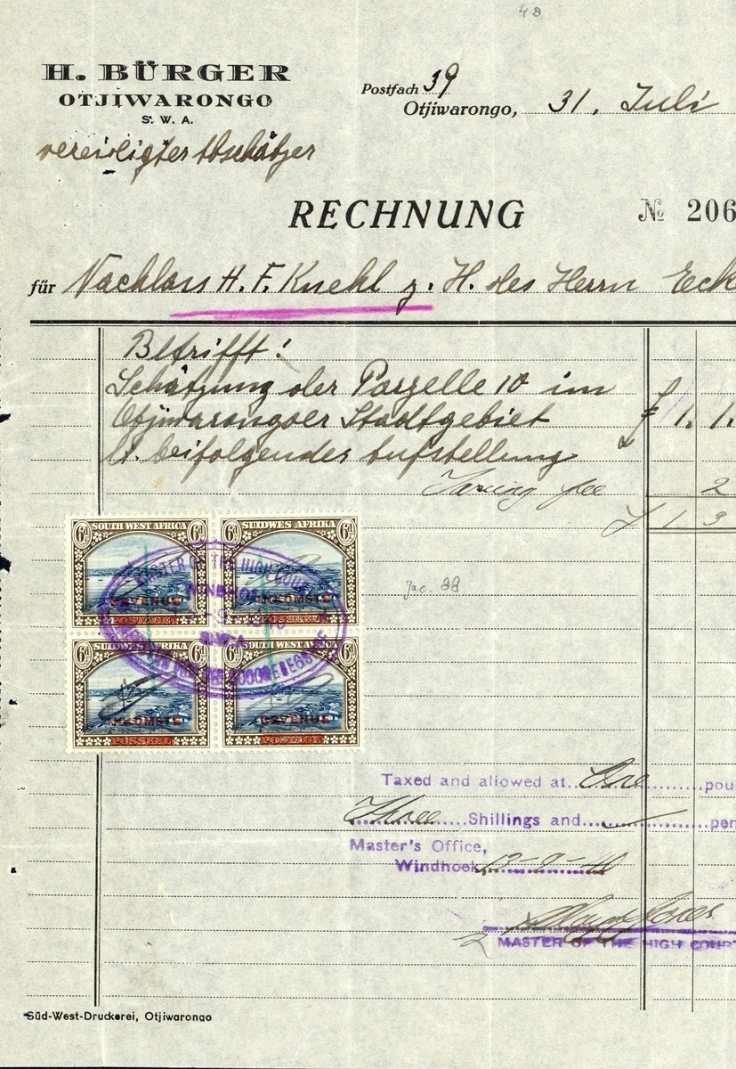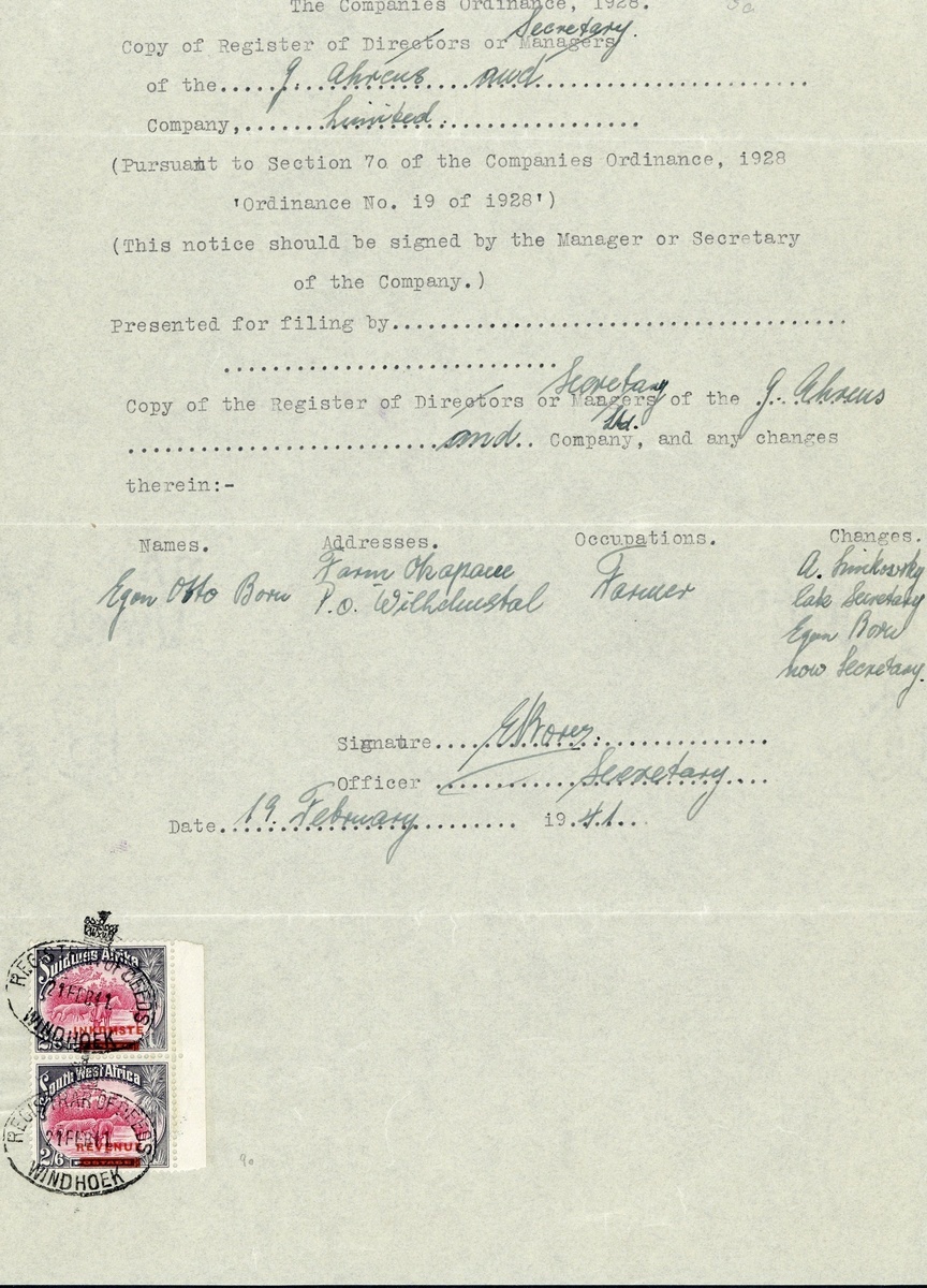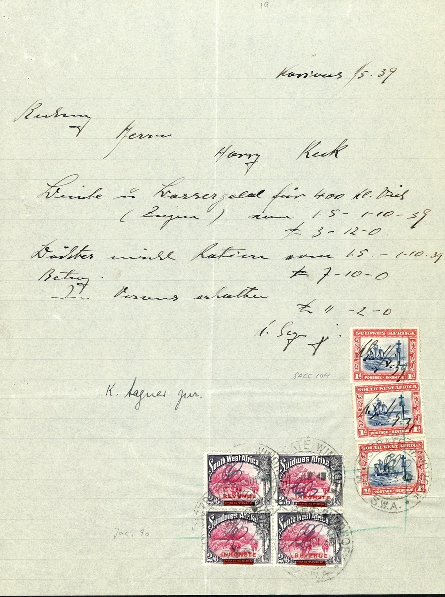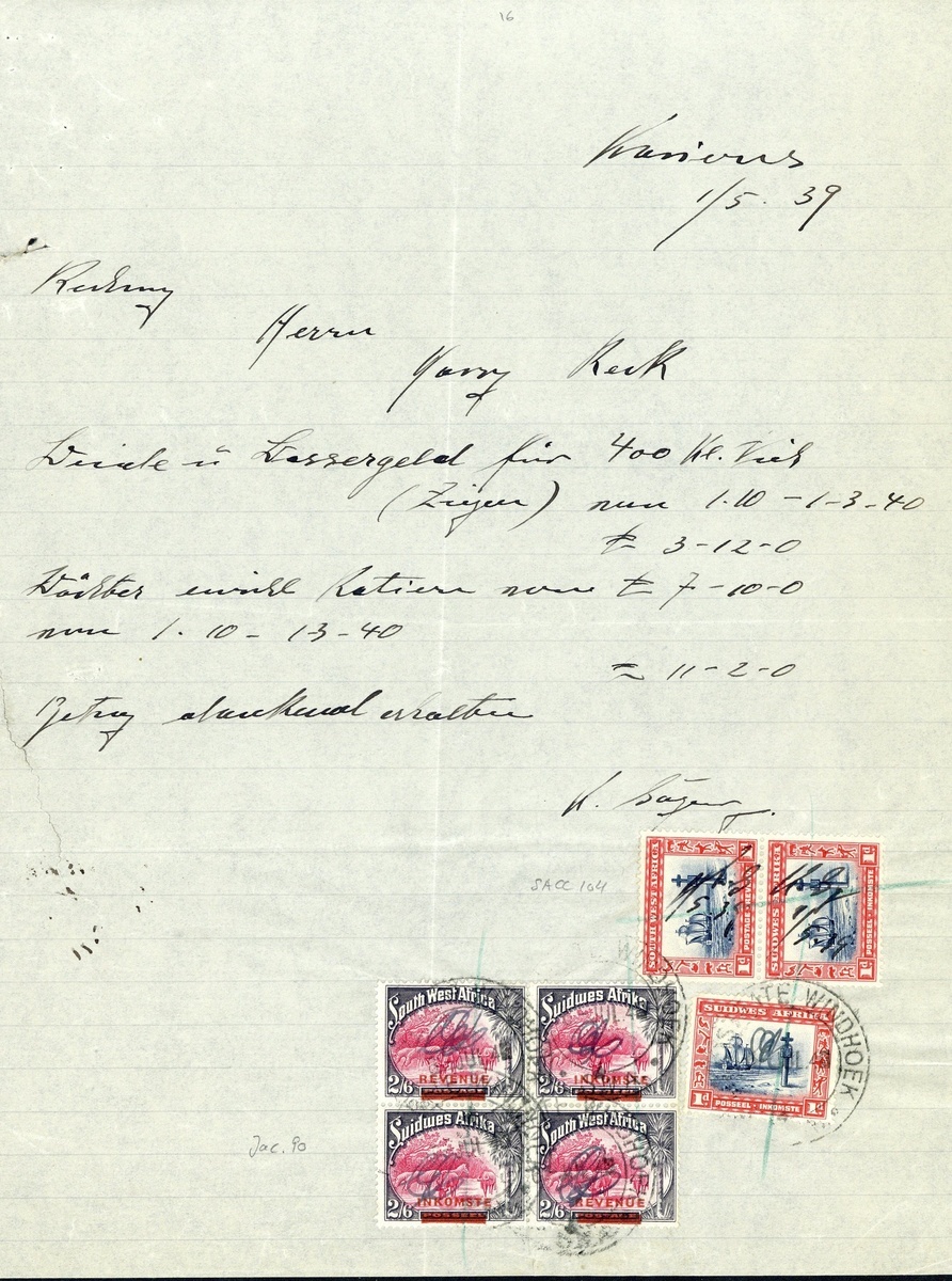 Group of document pages (10) variously franked including 1/- purple and purple (13) including bi-lingual pairs (5), 2/6d. green/orange, and 5/- grey and brown, (14) including block of nine, and a bi-lingual pair, showing a range of South West Africa overprints and settings. Fine.