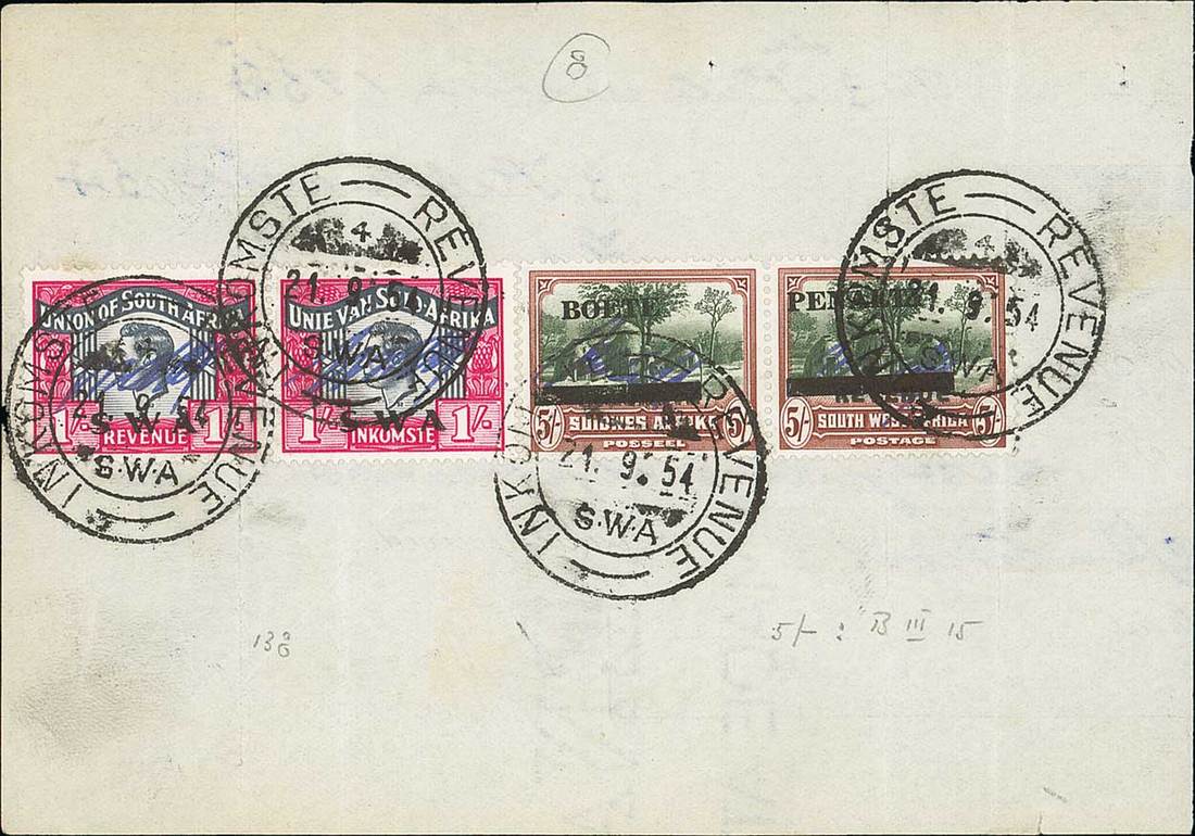 Group of Documents (7) variously franked including 5/- sage-green and brown (10, including three bi-lingual pairs), and 2/6d. carmine and grey, block of five including two horizontal pairs, used in combination with assorted KGVI revenues. A most interesting group for further study, with some of the 5/- values showing slanted or badly misplaced overprints. Photo