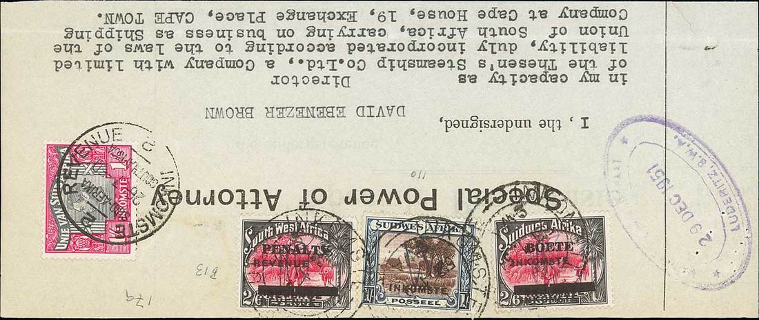 Pair of document pages showing varieties, the first a power of Attorney header bearing 2/6d. carmine and grey (2), showing underlying revenue overprint quadruple, one in the centre and three at foot, the second document bearing 2/6d. carmine and grey, vertical strip of four, without previous revenue overprint showing variety black bar omitted, fine and unique; these four are the only recorded examples. Photo