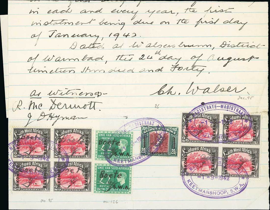 Group of documents (4) bearing unusually late usage, including KGVI Series 4 £2 green, and 2/6d. carmine and grey pictorial overprinted "inkomste/ revenue" block of four, each with manuscript "Boete" overprint, also 1955 document bearing KGVI 5/- pink and blue with wide "S W A" overprint, and 2/6d. green and red 'Arms' design. Each of the documents in this showing the only recorded usages. Photo