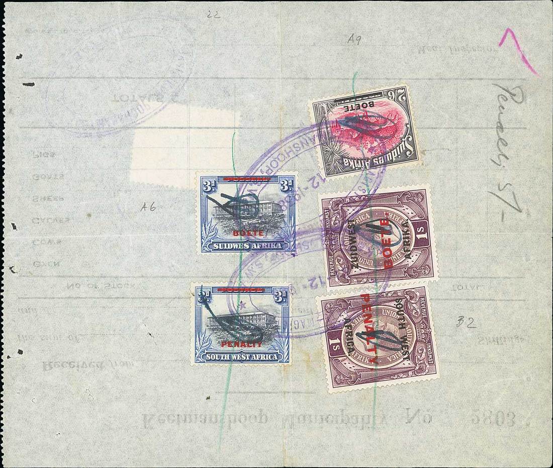 Collection of doocument pages (26) variously franked, bearing usage of all recorded values from 3d. and 6d. (very rare used), to 10/-, featuring many attractive multi-coloured multiple frankings, multiple usages, numerous bi-lingual pairs and usage alongside a wide range of revenue and postal issues. A super lot, these issues far scarcer used than mint. Viewing recommended. Photo