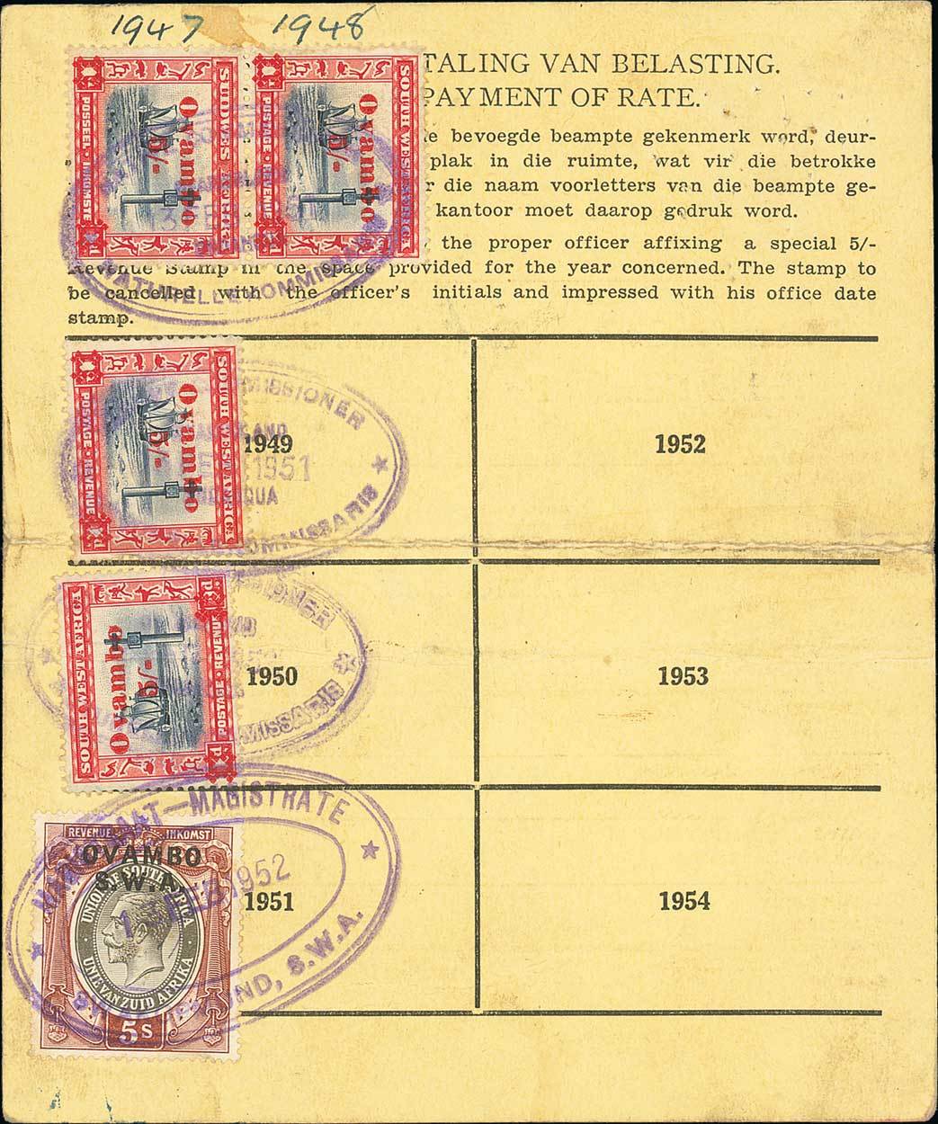 1951 Registration card bearing payment for 1941-51, the first four years paid with 1931 'Cape Cross' postage 1d. surcharged "ovambo/ 5/-", (1947 and 48 paid with bi-lingual horizontal pair, the only recorded), 1951 paid with Large format 5/- grey and brown overprinted "ovambo/ s.w.a.", the first four cancelled by Oval "native commissioner" cancellations dated "3 feb 1951", the 1951 payment cancelled by Swakopmund magistrate oval h.s. dated a year later. Filing folds running through two surcharged 1d. values as is to be expected; still an extremely rare survival, being one of only two surviving cards from from this minuscule tribe which had only 405 taxpayers in 1936, and doubly unique being the only recorded use of the 5/- grey and brown, and the only recorded bi-lingual pair with Ovambo overprints. Photo