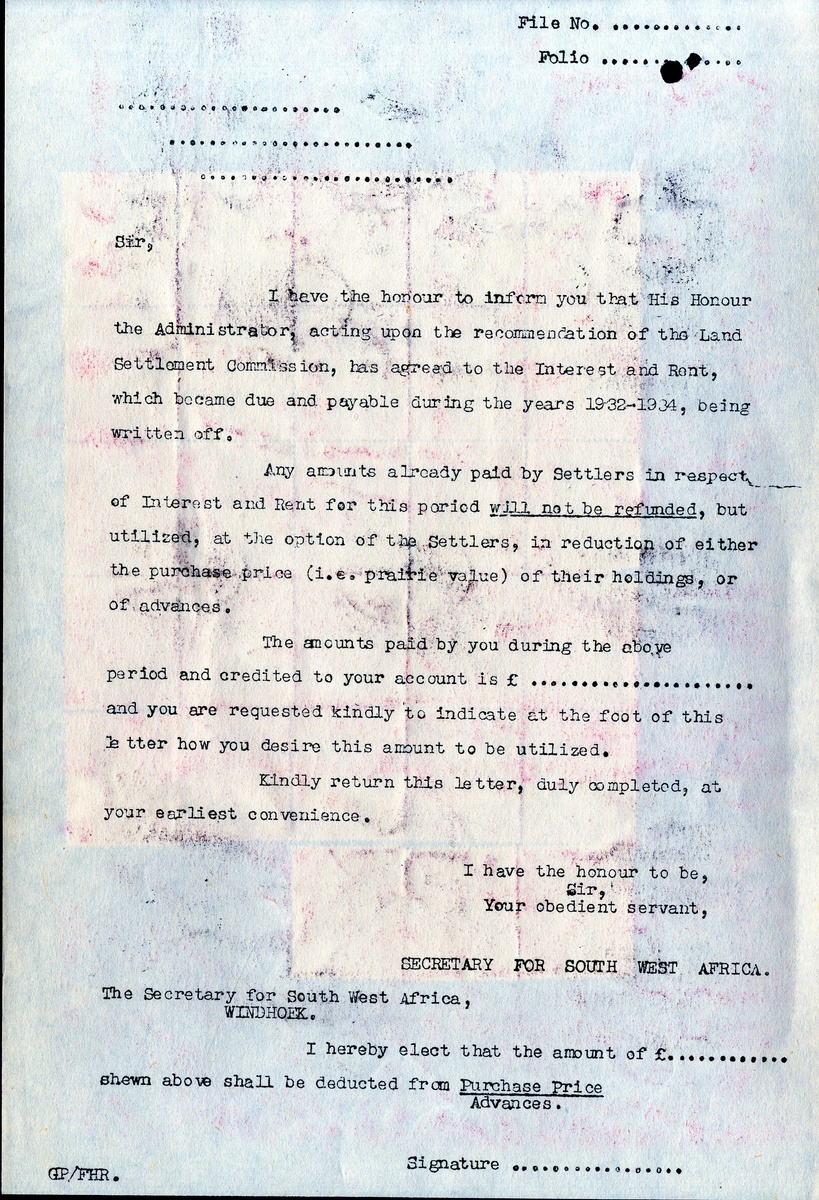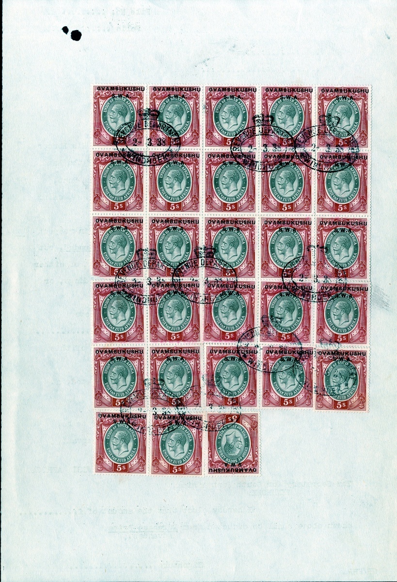 1913 South Africa revenue 5/- grey and brown, overprinted "ovambukushu/ s.w.a." (28) including block of fifteen (5x3) cancelled by "revenue department/ windhoek" crowned oval d.s., dated 2/3/38, affixed to filing page returned to Windhoek for destruction upon withdrawal of the issue. A remarkable survival, and particularly desirable as a large multiple.