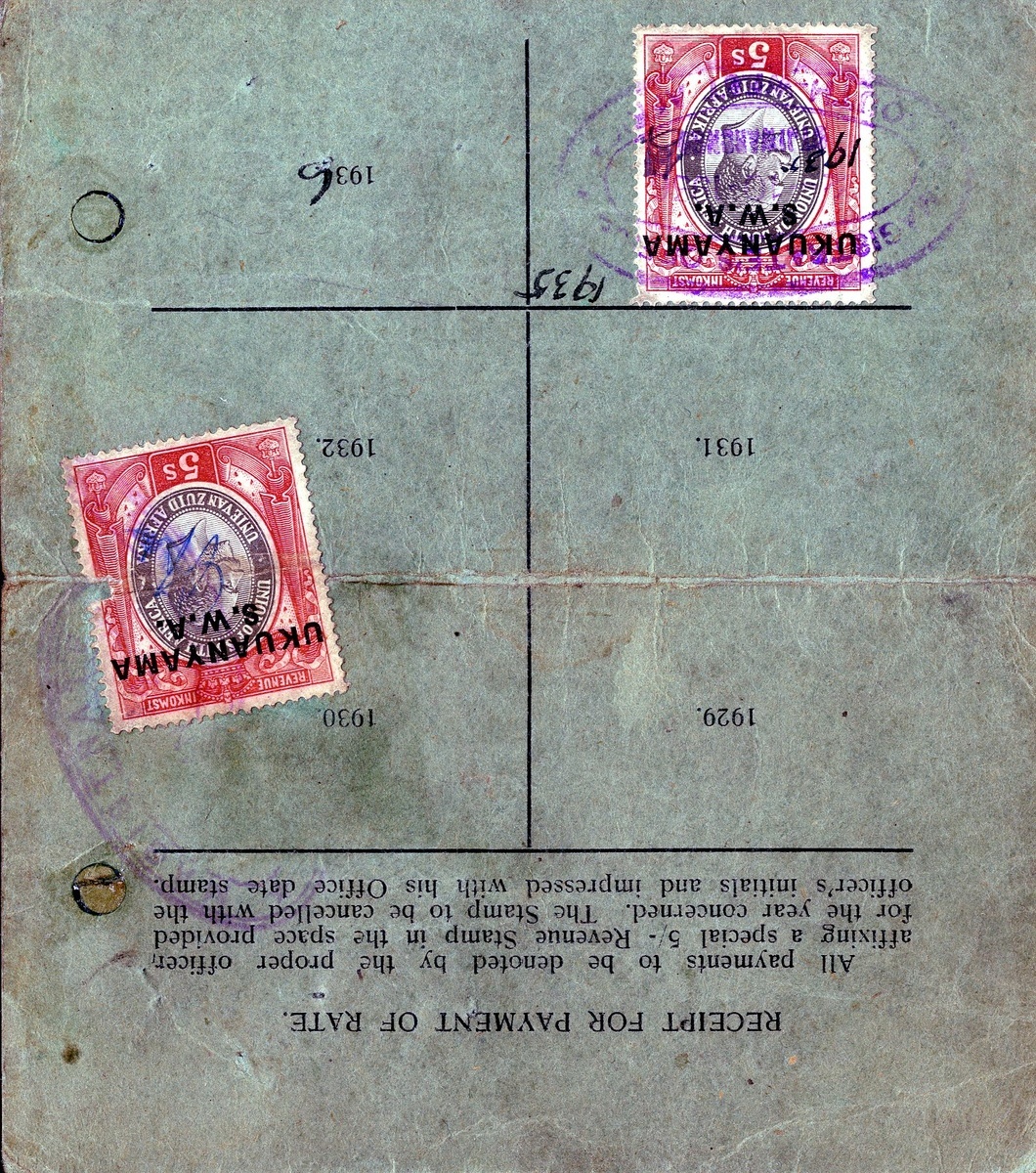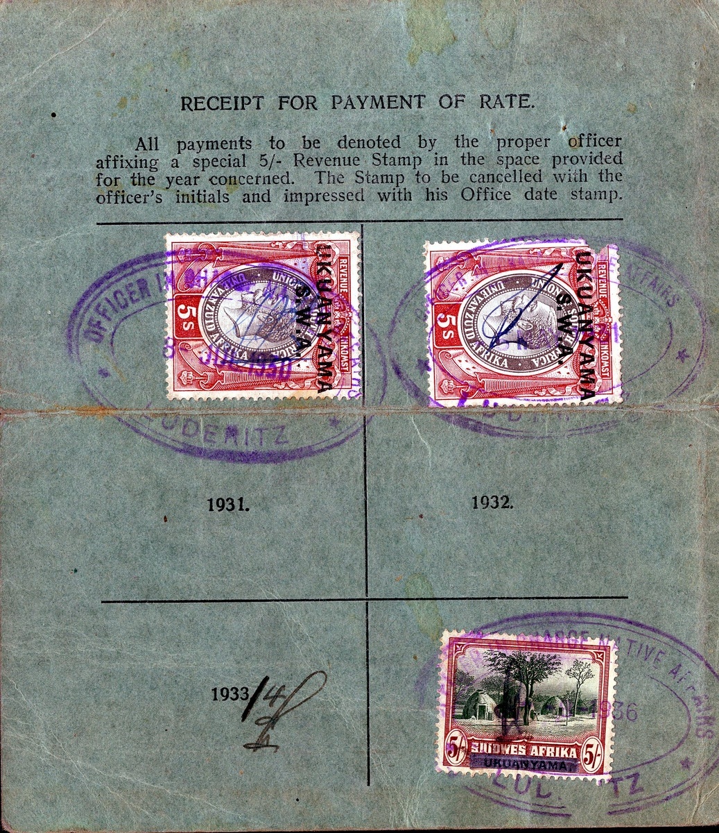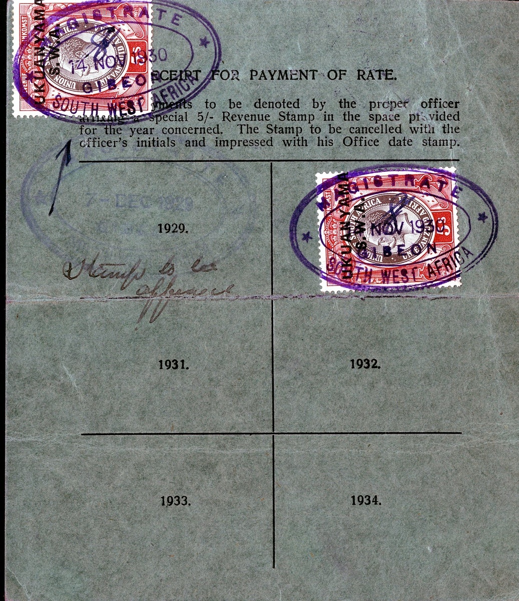 Group of Registratiion cards (4) bearing Large format "ukuanyama/ s.w.a." overprint on 5/- grey and brown South Africa revenue, the first bearing two stamps; payment for 1929 (the first year of the tax) marked "stamps to be affixed" with indistinct oval d.s., the two stamps affixed and cancelled "magistrate/ south west africa" dated almost a year later 14.11.1930; possibly indicating late arrival of stamps or payment or both! A second card bearing two 5/- grey & brown with 1931 pictorial surcharge 5/-, a later card bearing payments for 1943/44 paid with small format revenue 5/- and 1931 3d. surcharged, the final card bearing a 5/- grey and brown SA revenue (one damaged). An interesting group.