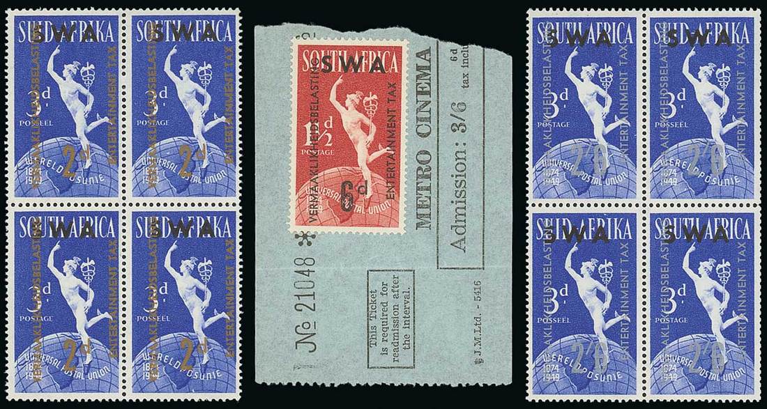 1931-57 collection on stock sheets (54) comprising 1931-37 collection on singles with values to 1/-, 1949 1d. on 3d. blue, 2d. on 3d. blue and 2/6d. on 3d. blue in fresh mint mint blocks of four (1d. thinned), 6d. on 1½d. red used on cinema tickets (2), 1955 1d. red & black bi-lingual block of four with minor shift of value, and 1957 rouletted 1d. and 2d. vertical strips of four. perf fourteen 6d. (3) including one pair, and 3d. to 1/- values in multiples of at least four, all fine mint. A most interesting lot, with multiples of these stamps scarce. Photo