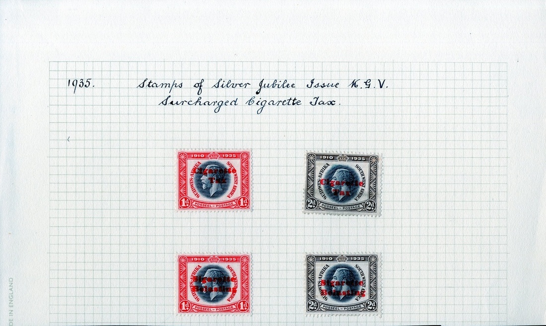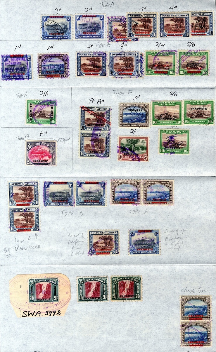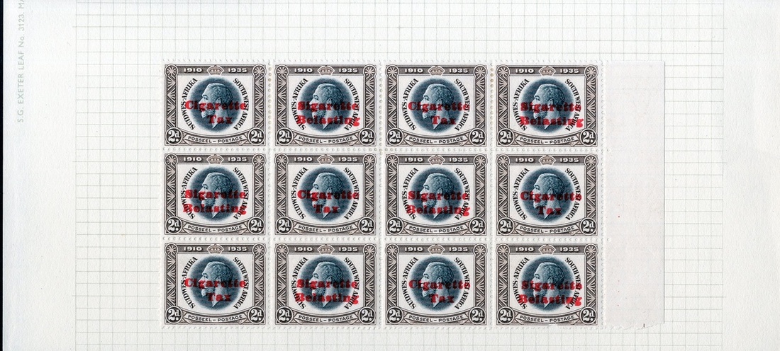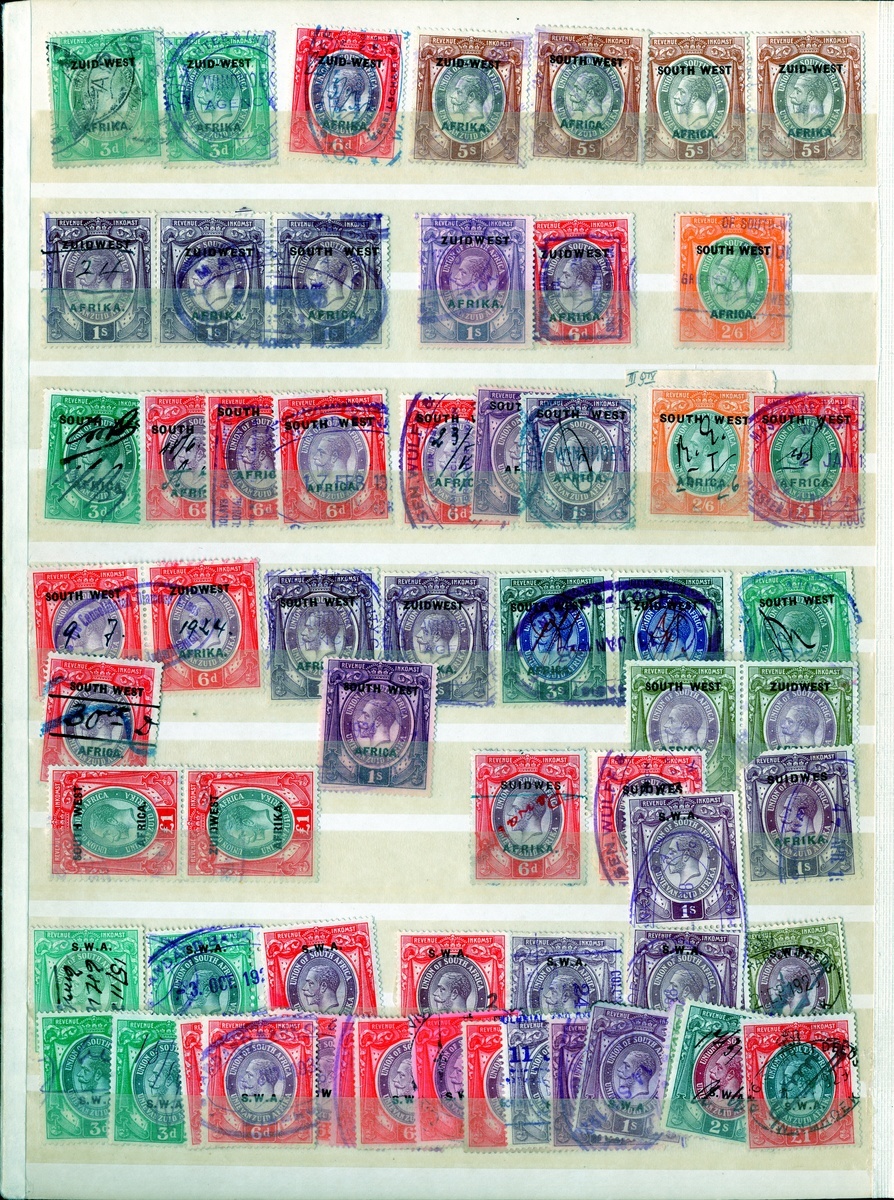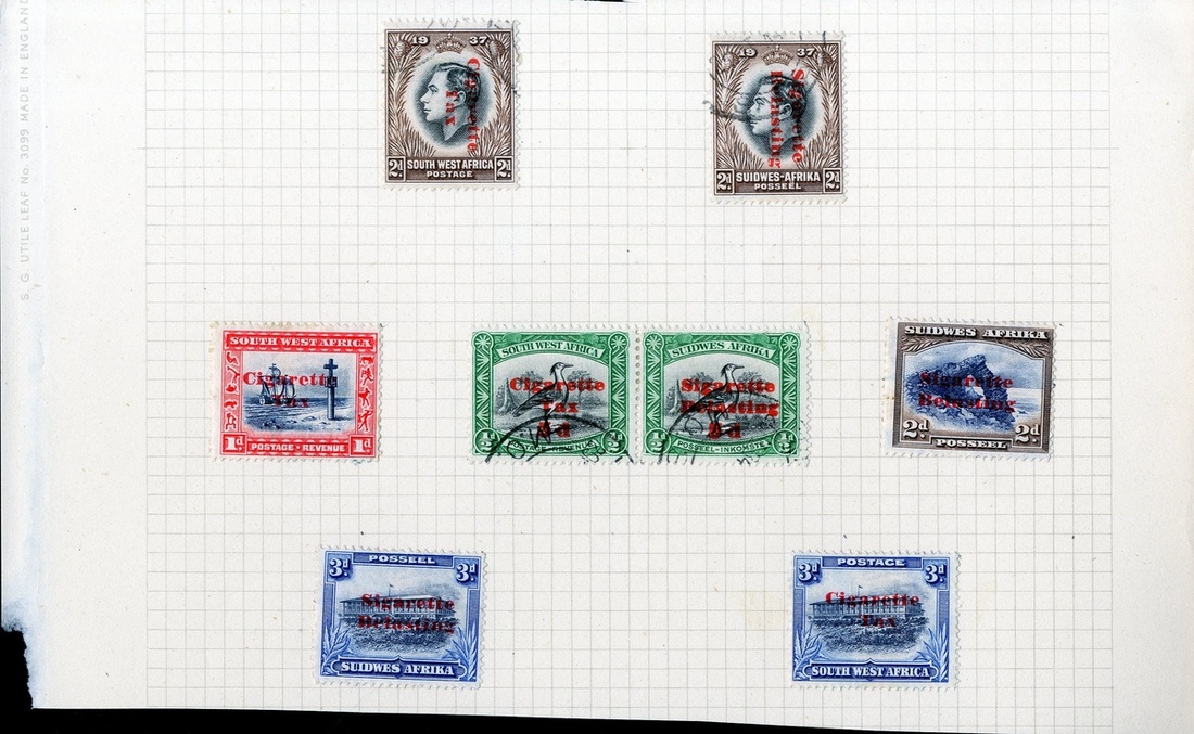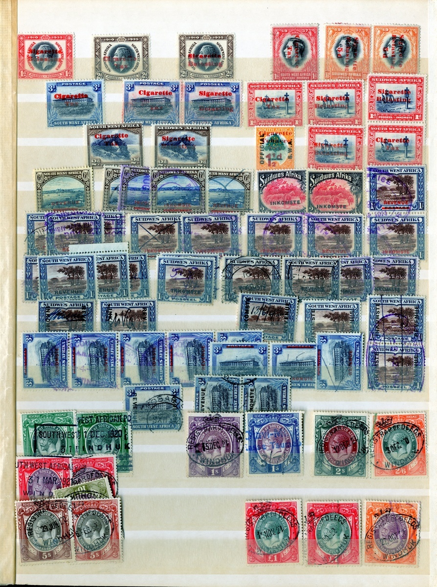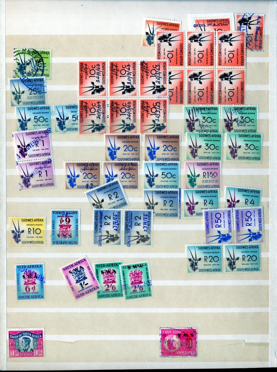 Small collection on Pages (c.250) and stock sheets including South Africa revenue overprints of various types on Large format issues with values to £1, Cigarette Tax (47) including 1935 Silver Jubilee 2d. brown and black mint block of twelve, and 1933 Official 1½d. on 6d. brown and blue (a very rare issue). Pictorial Revenue overprints with values to 20/- including traansposed language errors, and 1960's 'Gemsbok' issues to 50r. An interesting accumulation.
