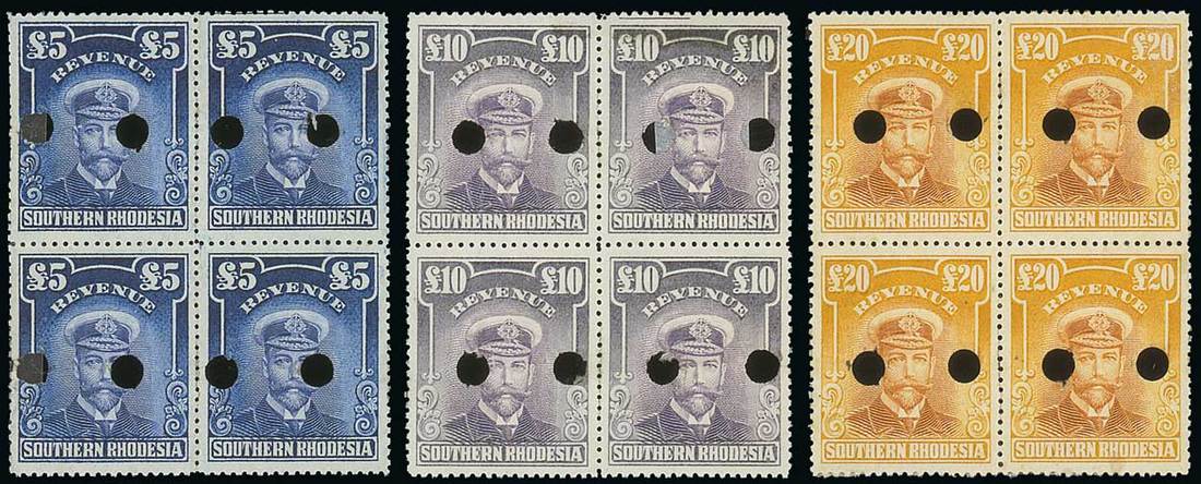 1924 "Admiral" design complete set of seven values 3/- to £20 (the £50 not recorded in this form), each an unused block of four, from proof sheets with security punches in each stamp. Attractive and rare. Photo