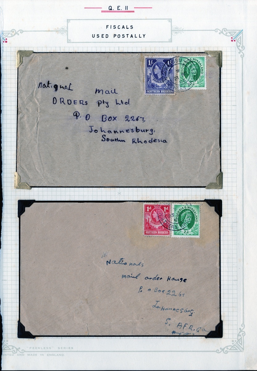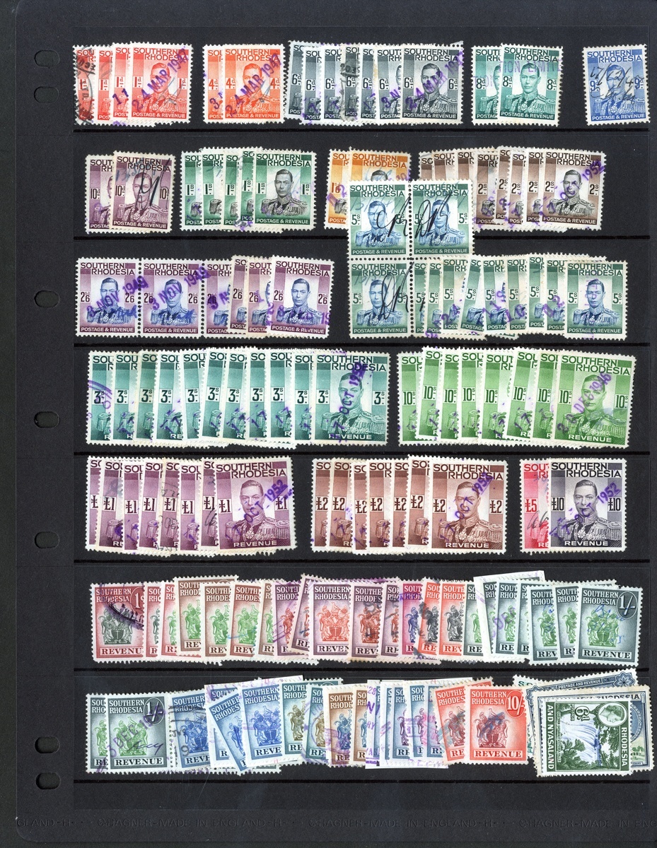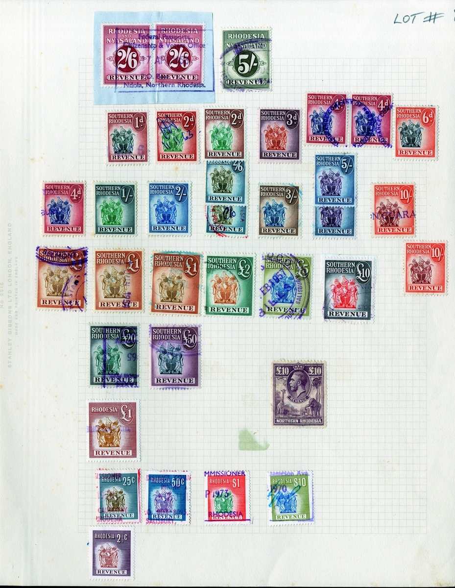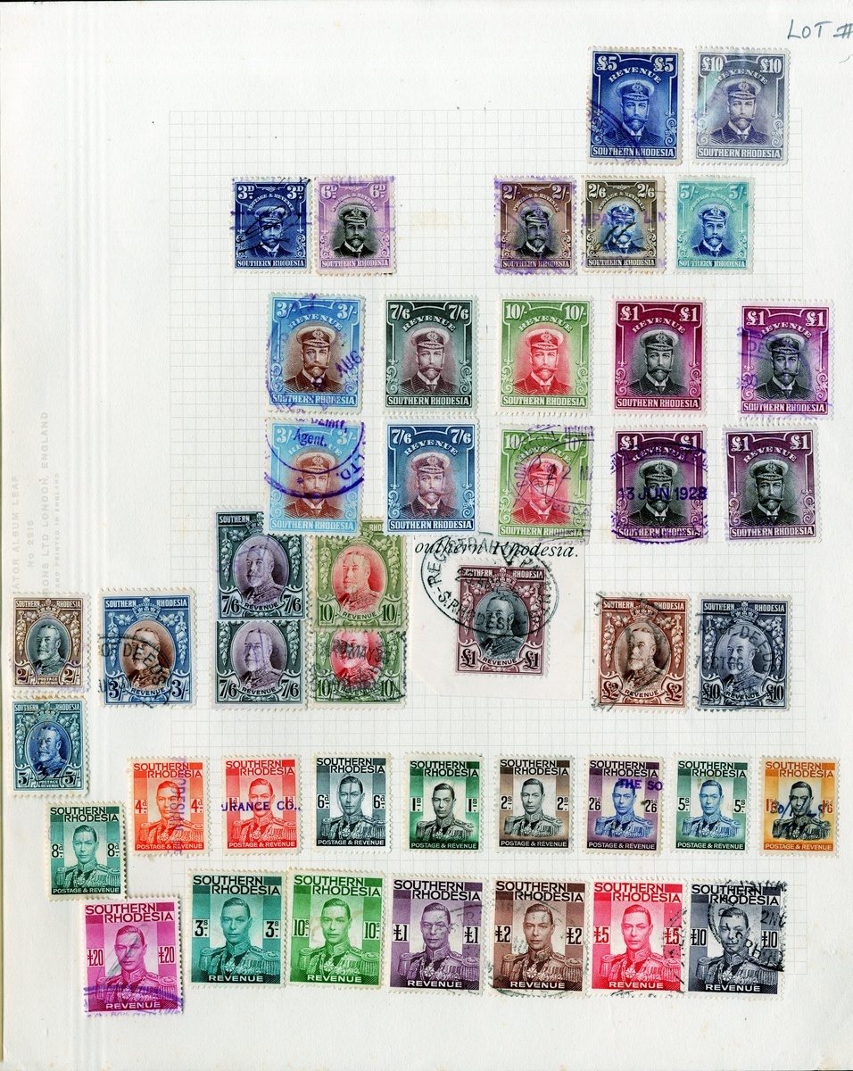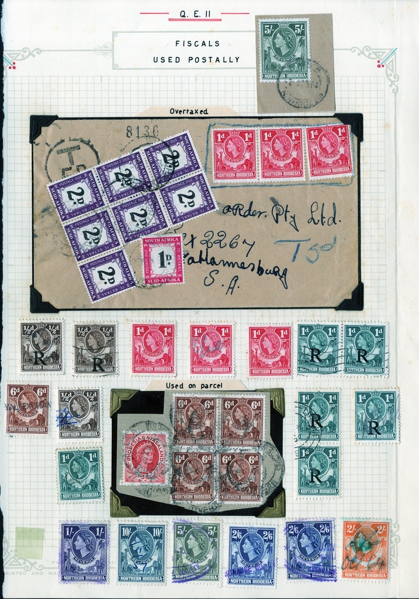 1924 values (12) to £1 with 7/6d., 10/- and £1 mint, 1931 values (8) to £10, 1937 values (43) to £10 and 1954 values to 10/-, together with a range of Postage values used fiscally; generally fine. Also Northern Rhodesia small selection on two pages with QEII values to 10/-, and revenues used as postage QEII 6d. (3) on a postage due cover, and 1/- and 1d. accepted for postage, aldo 6d. (4) on piece. An interesting group.