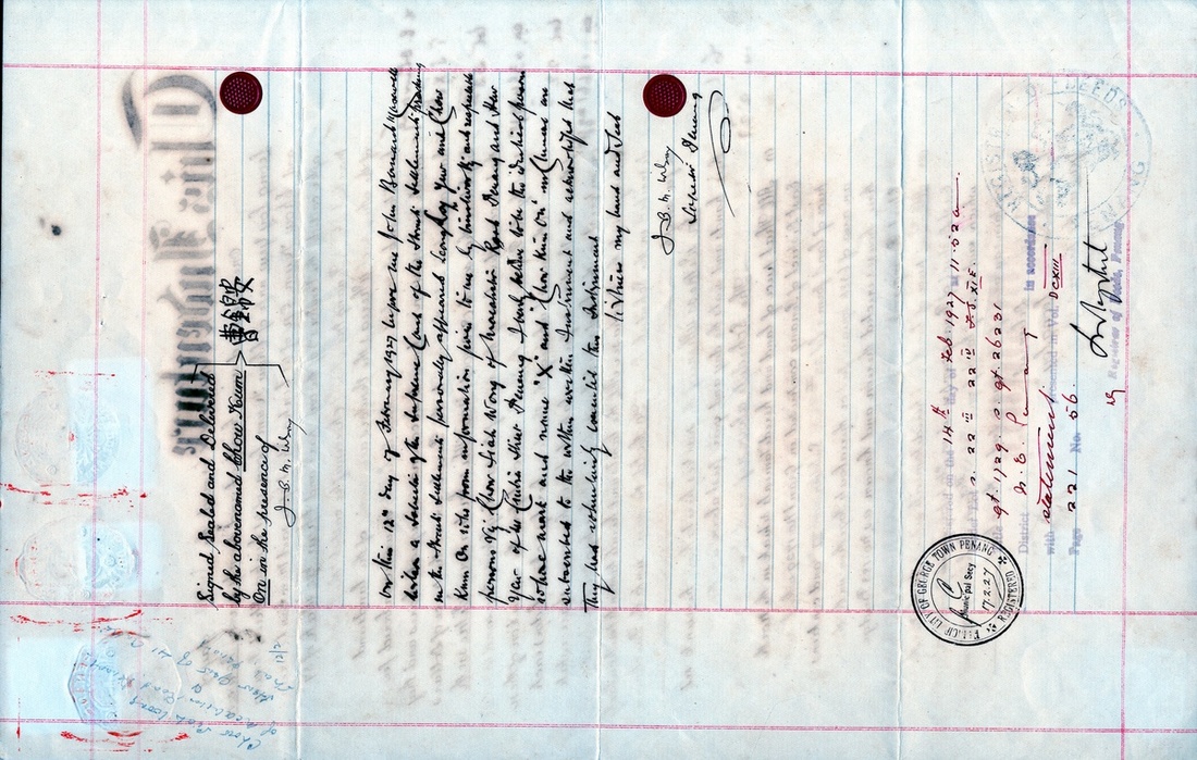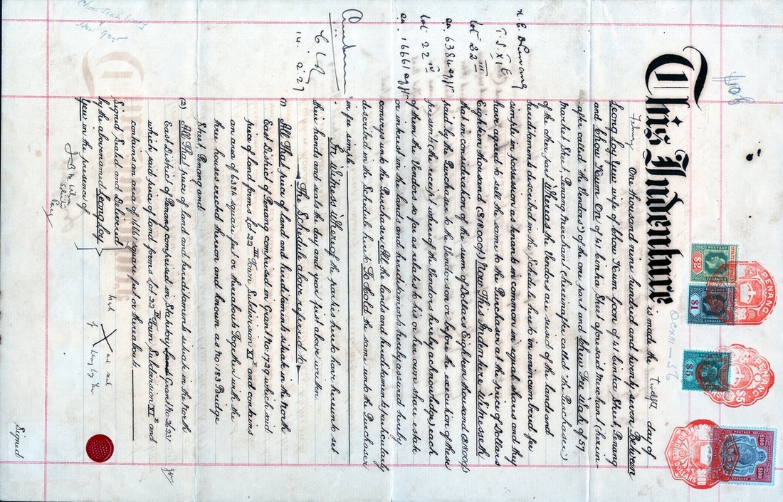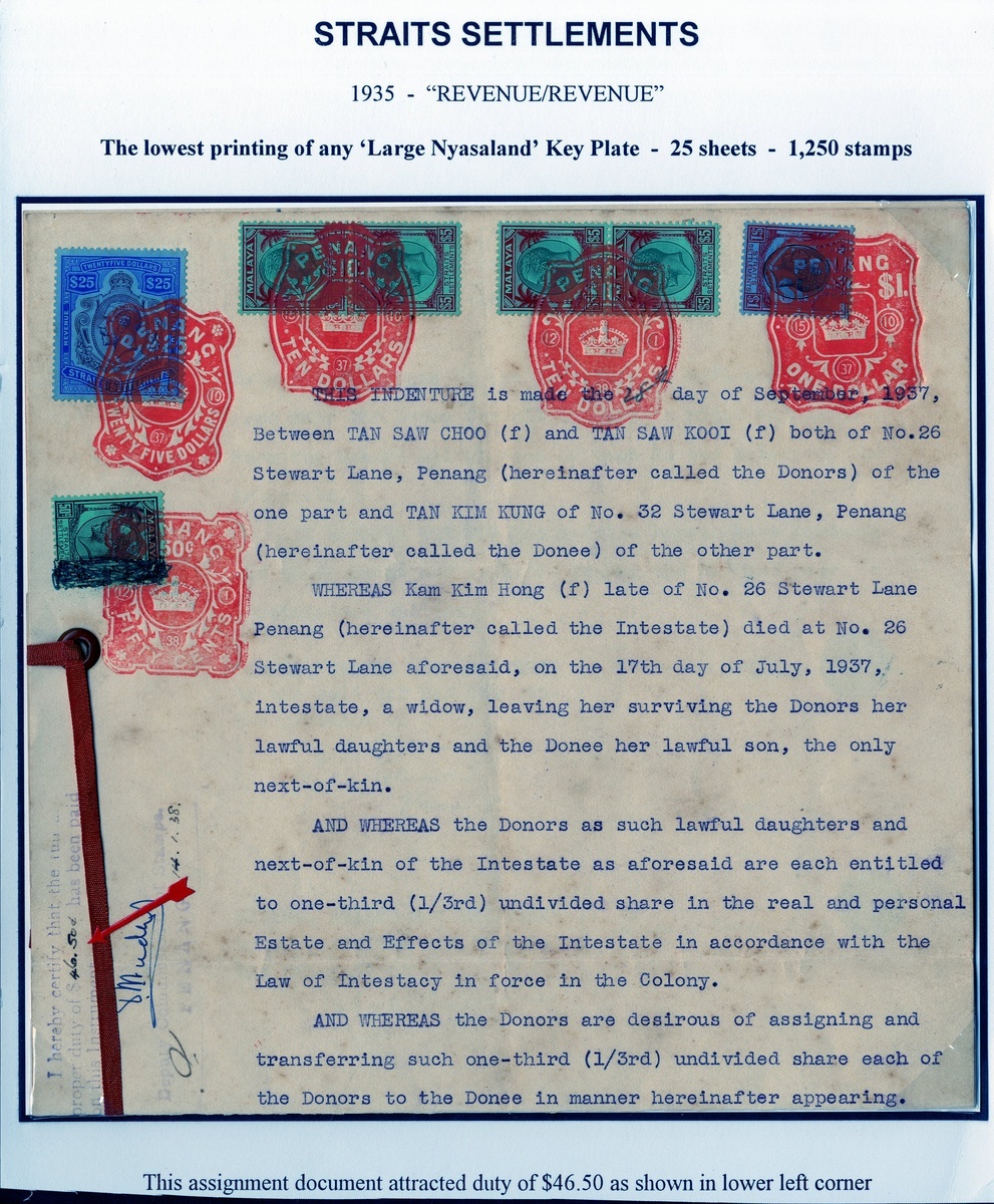 1927 (14 Feb.) indenture bearing KGV $100 black and carmine on blue, and postage $1, $2, and $5, each tied by Penang embossed datestamps in red, and 1935 (15 Oct.) indenture bearing KGV $25 purple and blue on blue, and postage 50c., $1 and $5 (4), each tied by penang red embossed datestamps. Fine.