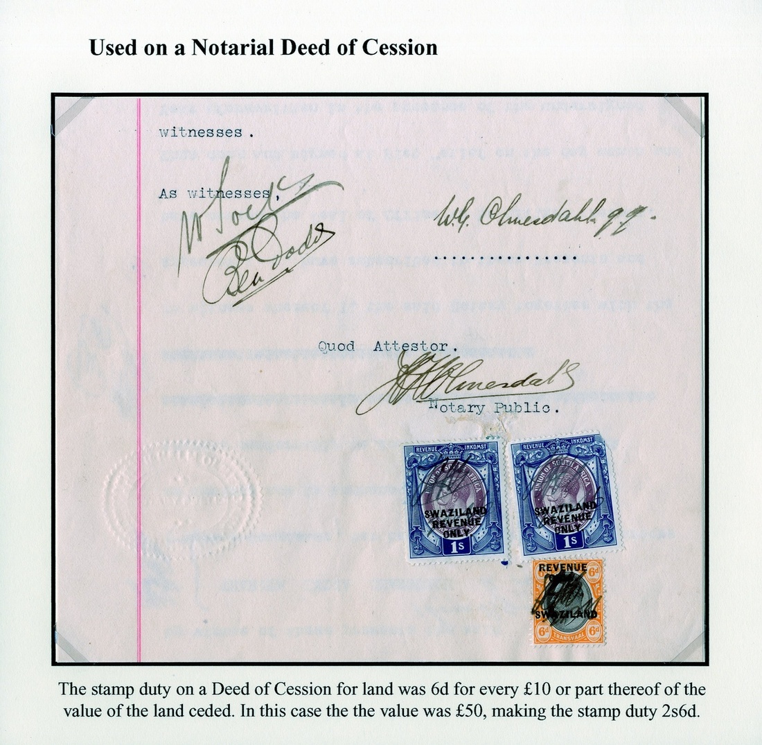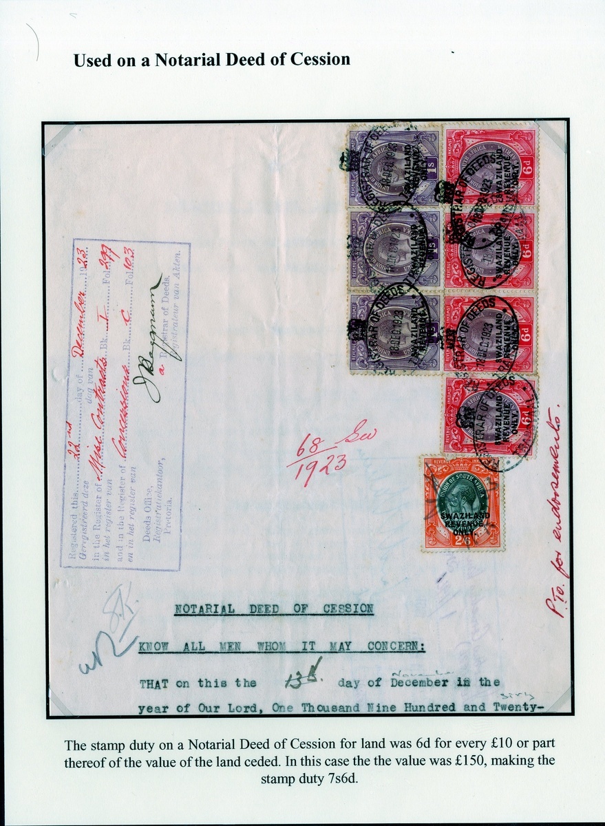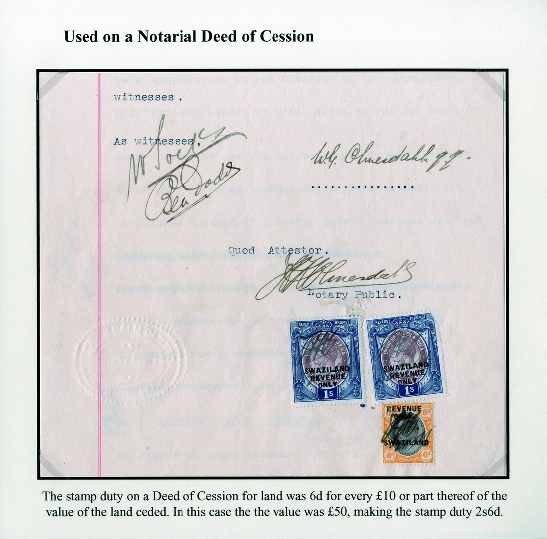 1922-28 Series 9 "swaziland/ revenue/ only." collection of document pages (4) and pieces (5) comprising 1922 deed of transfer bearing 5/- and £1, 1928 Grant of Crown Land bearing £1, 1926 Notarial Deed of Cession bearing 1/- (2) and Series 8 6d., the pieces all showing combination usage with Union issues without overprint. A fine group.