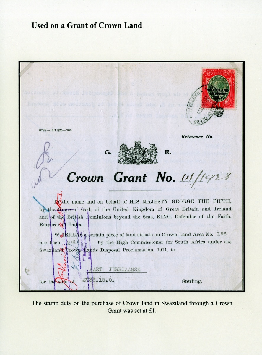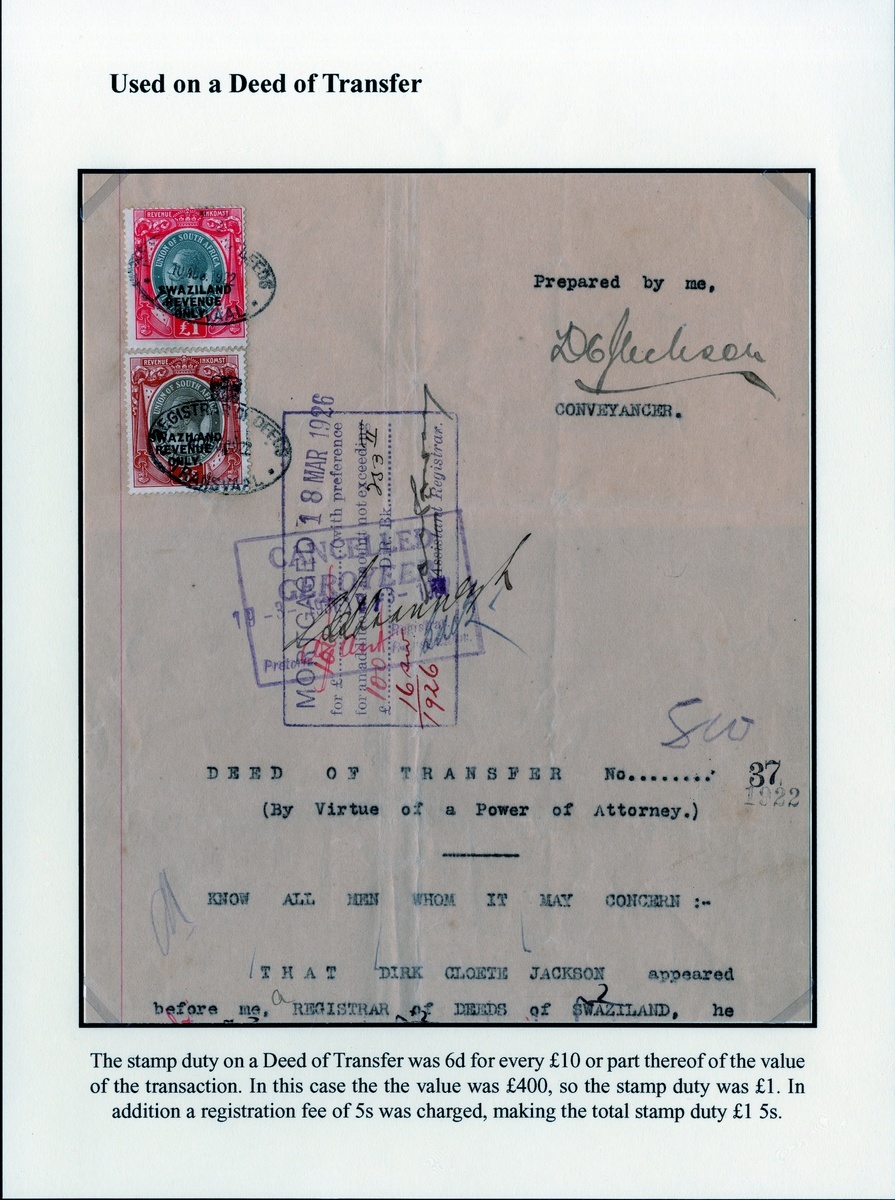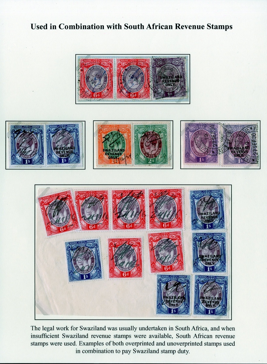 1922-28 Series 9 "swaziland/ revenue/ only." collection of document pages (4) and pieces (5) comprising 1922 deed of transfer bearing 5/- and £1, 1928 Grant of Crown Land bearing £1, 1926 Notarial Deed of Cession bearing 1/- (2) and Series 8 6d., the pieces all showing combination usage with Union issues without overprint. A fine group.