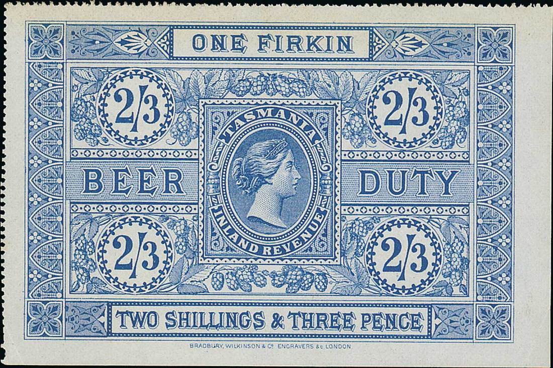1881 Bulk beer 1/3d. to 13/6d. set of six, fresh and very fine unused with rich original colours, each value (as always) with at least one straight edge from the imperforate sheet edge. Beautifully designed using the Bourne Head portrait (more commonly seen on Falkland Islands and Transvaal issues) with the inner frame adorned with hops, this set surely rank amongst the most visually appealing revenue stamps ever issued. Spectacular and very rare. Ellsmore $2,300 (£1,400) Photo
