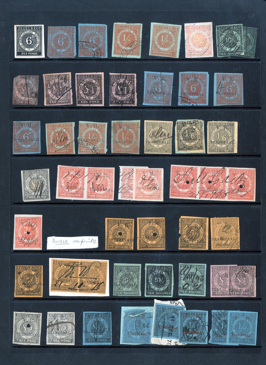 1893-94 used collection on stocksheets (50) including 1893 cross hatched 5/- (4) including document fragment bearing three examples, with 1894 1/- (4), also 1894 "Arms" 6d. (4), 1/- (14, including a strip of four), and 5/- (19) including very fine used block of twelve, and 1894 typeset 1/- (2), and 5/-, usual faults for these large format issues though a fine lot containing some most unusual multiple usage.
