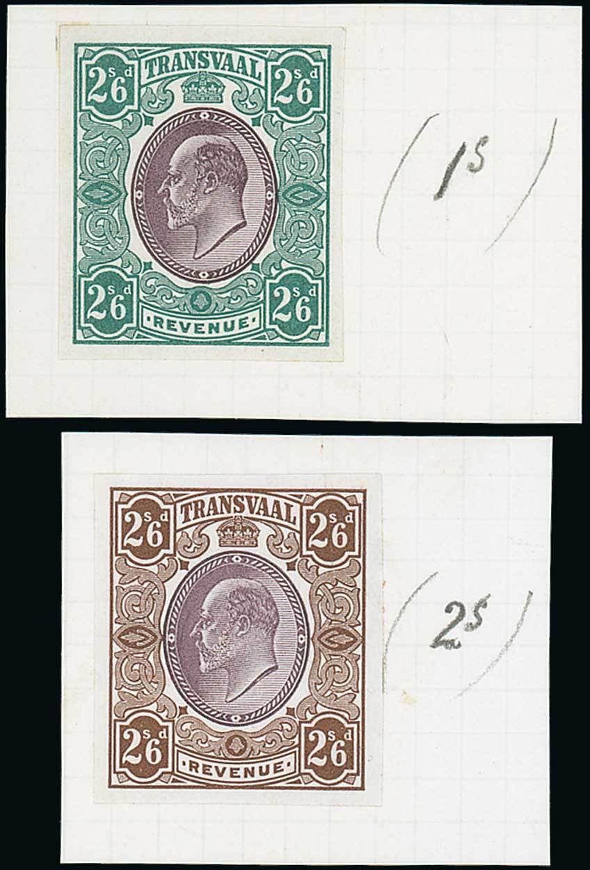 c.1902 colour trials denominated 2/6d., (2), in green and purple and brown and purple, each gummed to pieces or appendix sheet annotated "(1s)" and "(2s)" respectively, reflecting the fact that these were the issued colours for the final stamps. Fine and rare. Photo