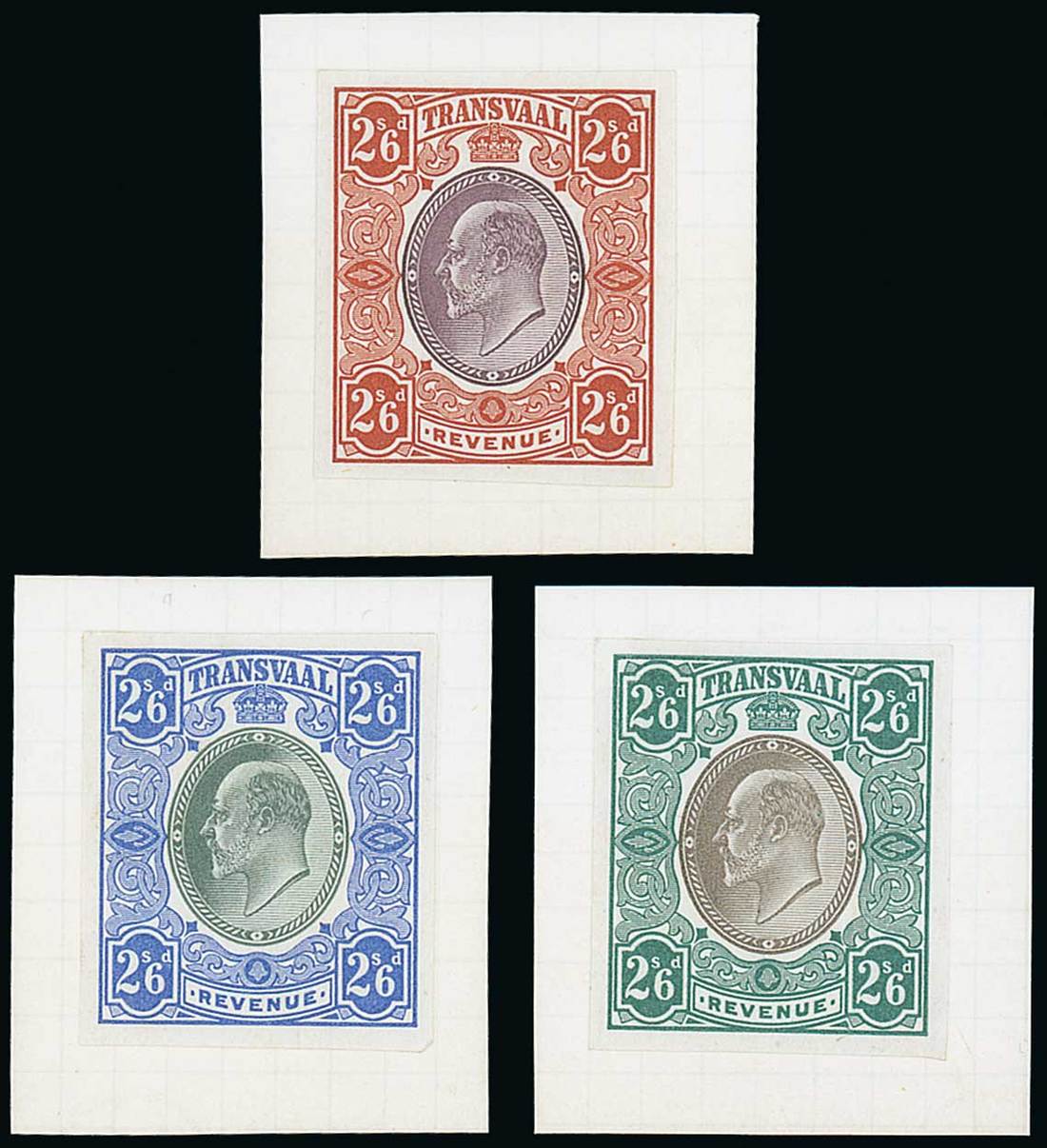 c.1902 colour trials denominated 2/6d., (6), on gummed paper , in olive-black and purple, purple and green, sage-green and purple, red-brown and purple, bright blue and green, green and grey, three gummed to pieces of archive paper, the others loose, many designs similar to issued colours. A fresh and appealing group, perfect for display. Photo