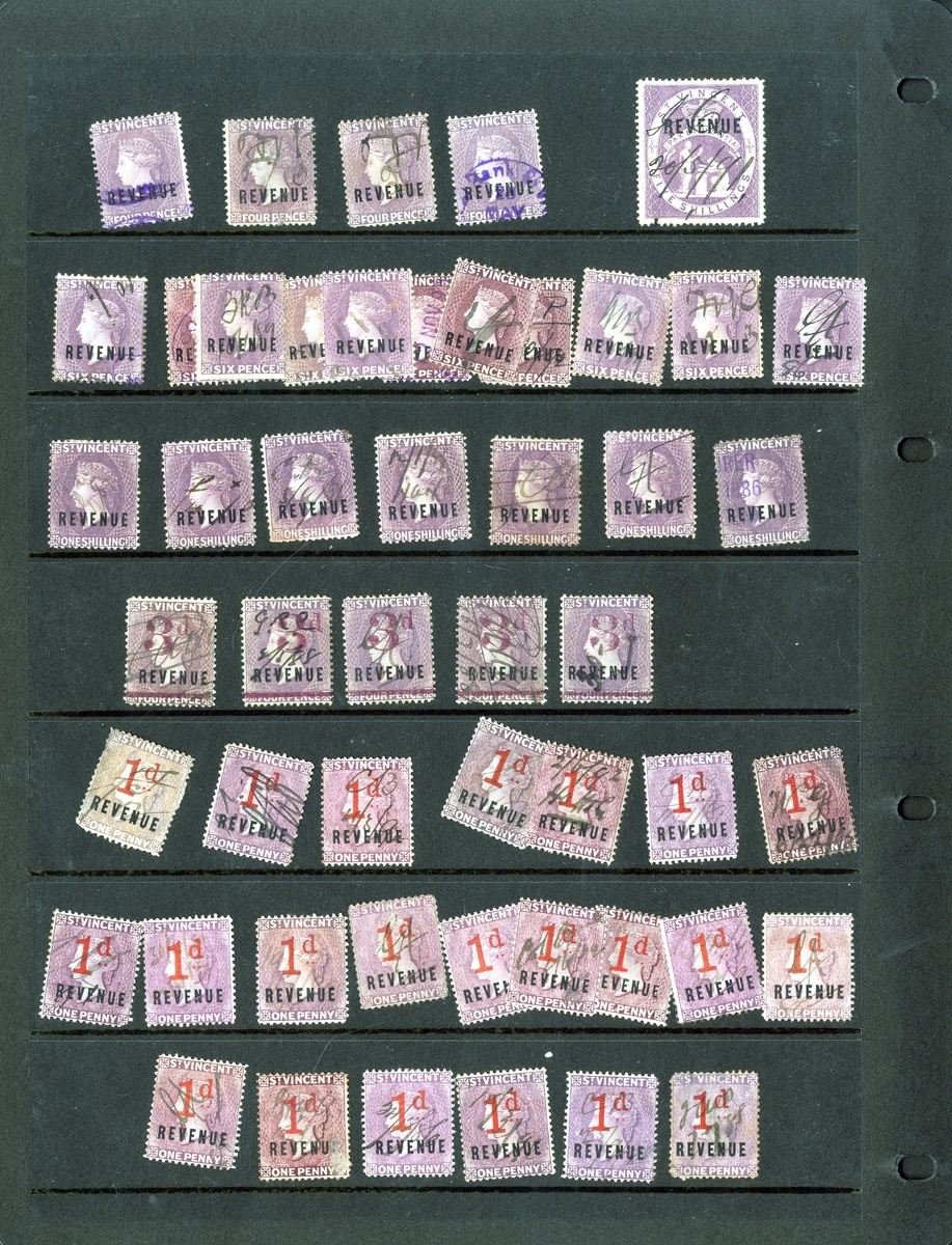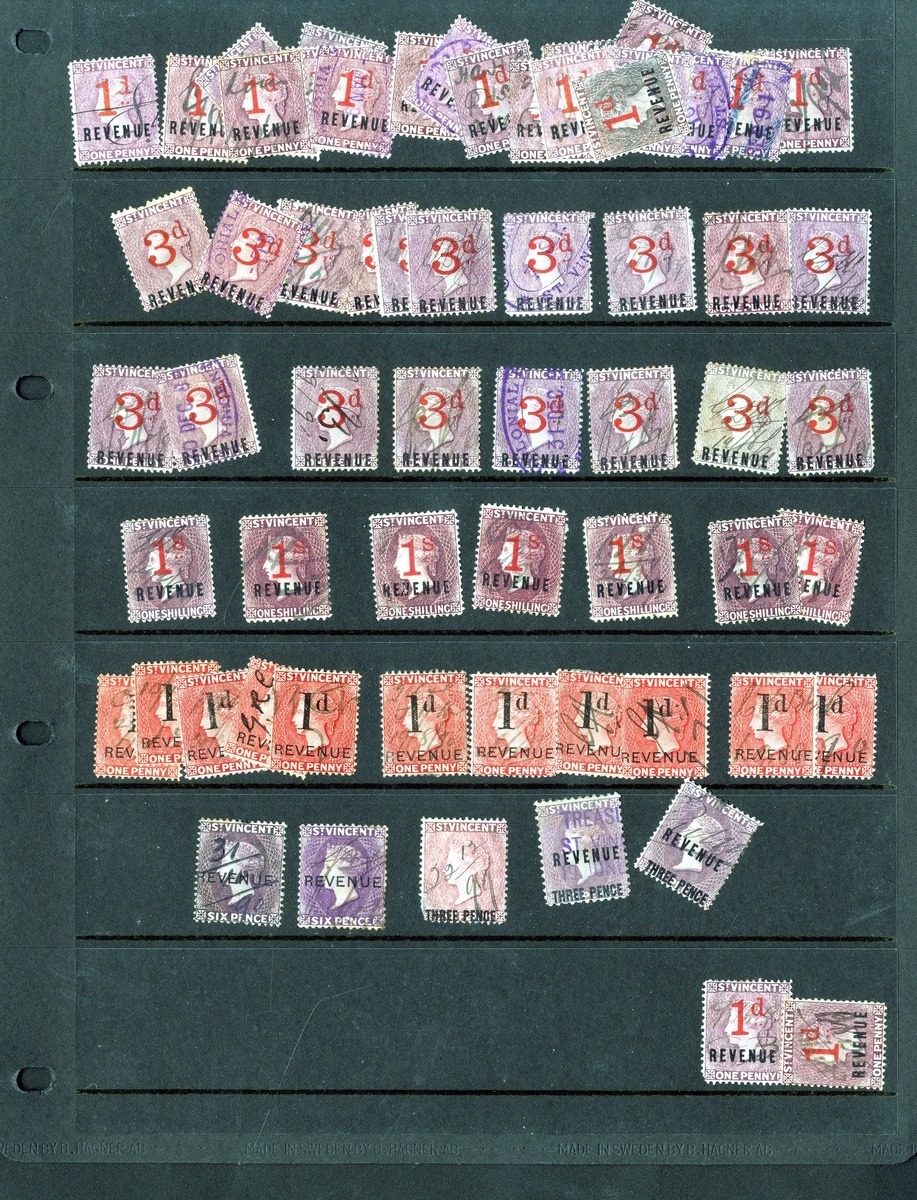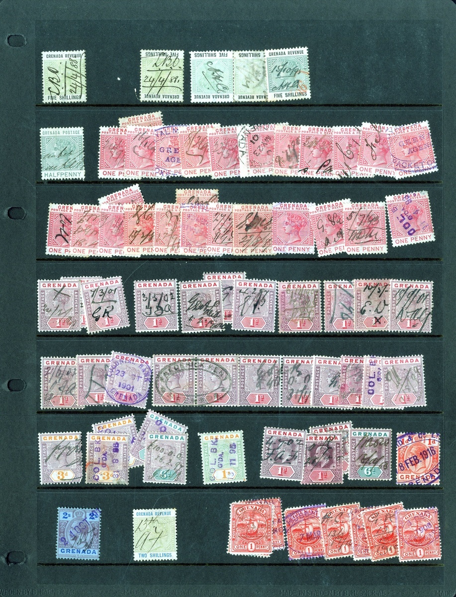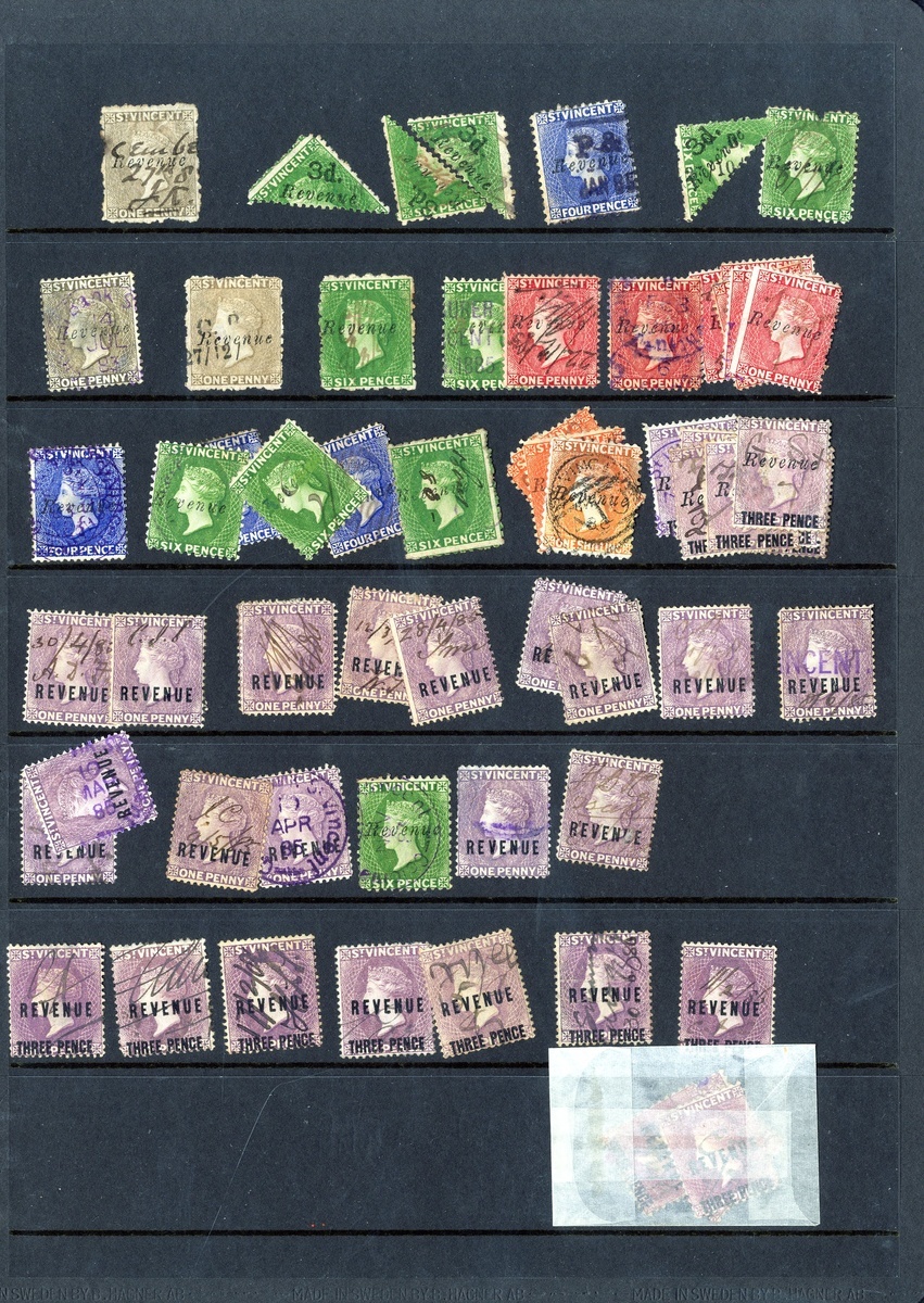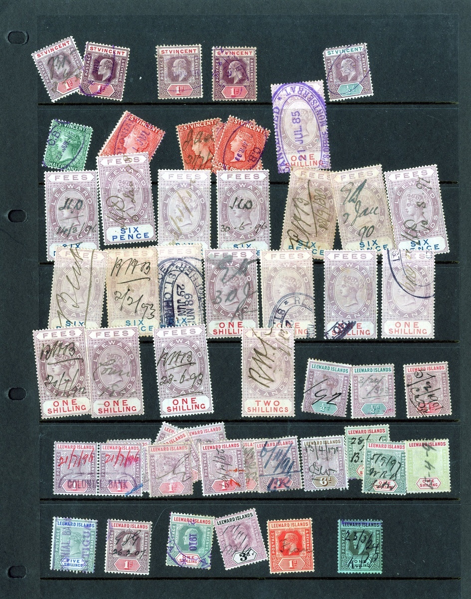 Collection on stock sheets with fine ranges of St Vincent including 3d. bisects (4 halves), and 1881-3 values to 1/- 1884-97 selection to 5/-, Grenada duplicated selection to 5/- values including Perkins Bacon issues (220+) to 5/-, St Lucia fine range of revenue overprints (30), Leeward Islands Fees values to 2/- including 1/- value used in Montserrat. Messy in places though a good sort sure to reward.