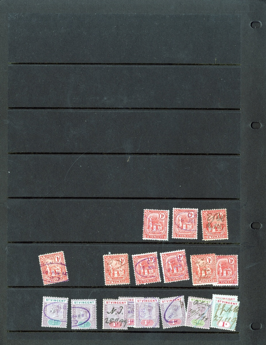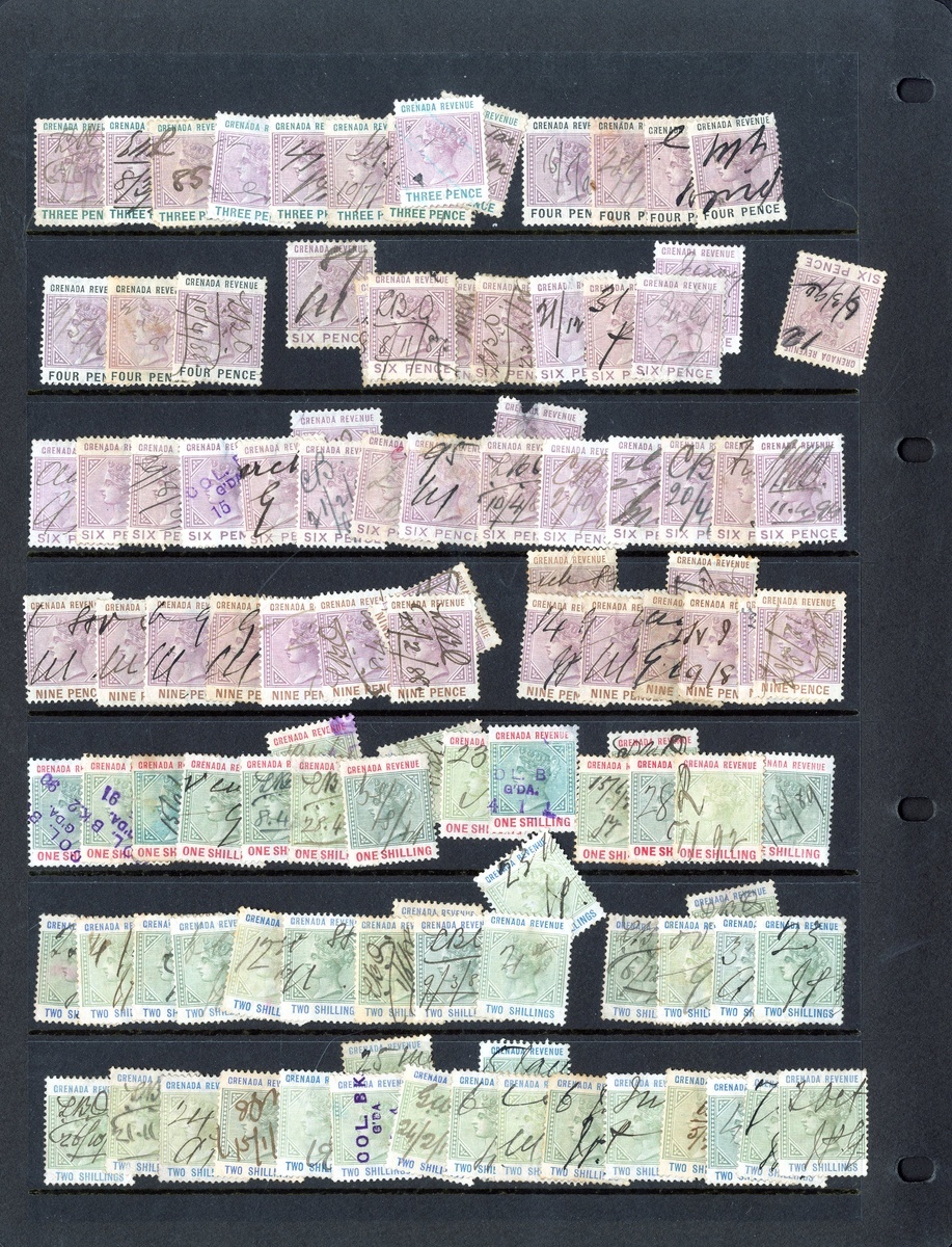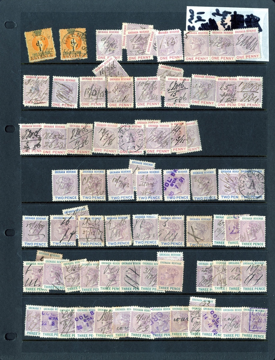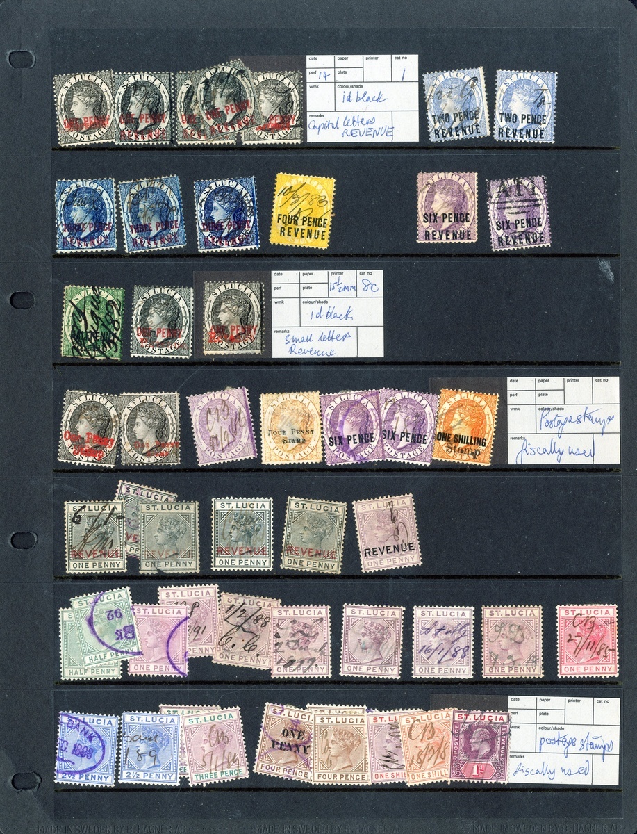 Collection on stock sheets with fine ranges of St Vincent including 3d. bisects (4 halves), and 1881-3 values to 1/- 1884-97 selection to 5/-, Grenada duplicated selection to 5/- values including Perkins Bacon issues (220+) to 5/-, St Lucia fine range of revenue overprints (30), Leeward Islands Fees values to 2/- including 1/- value used in Montserrat. Messy in places though a good sort sure to reward.