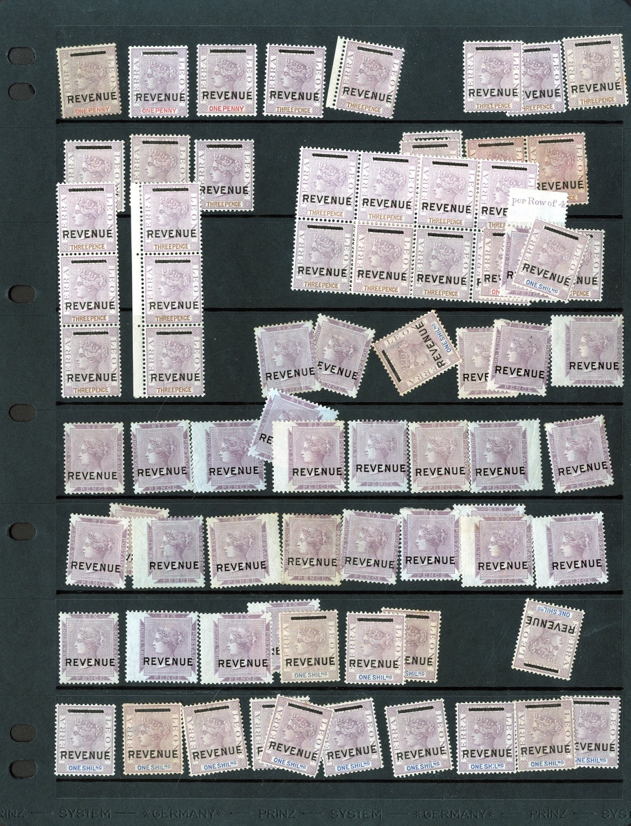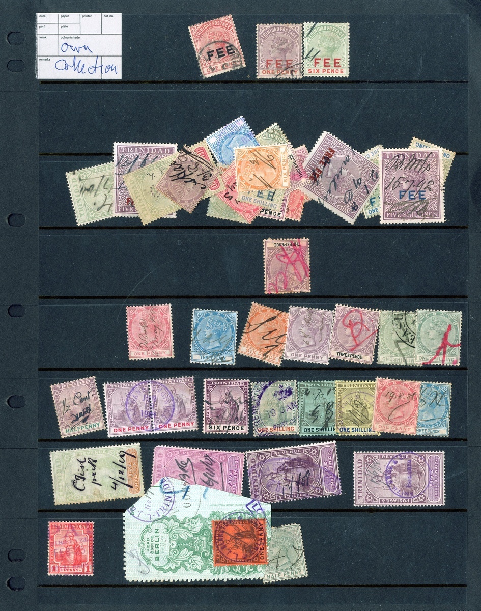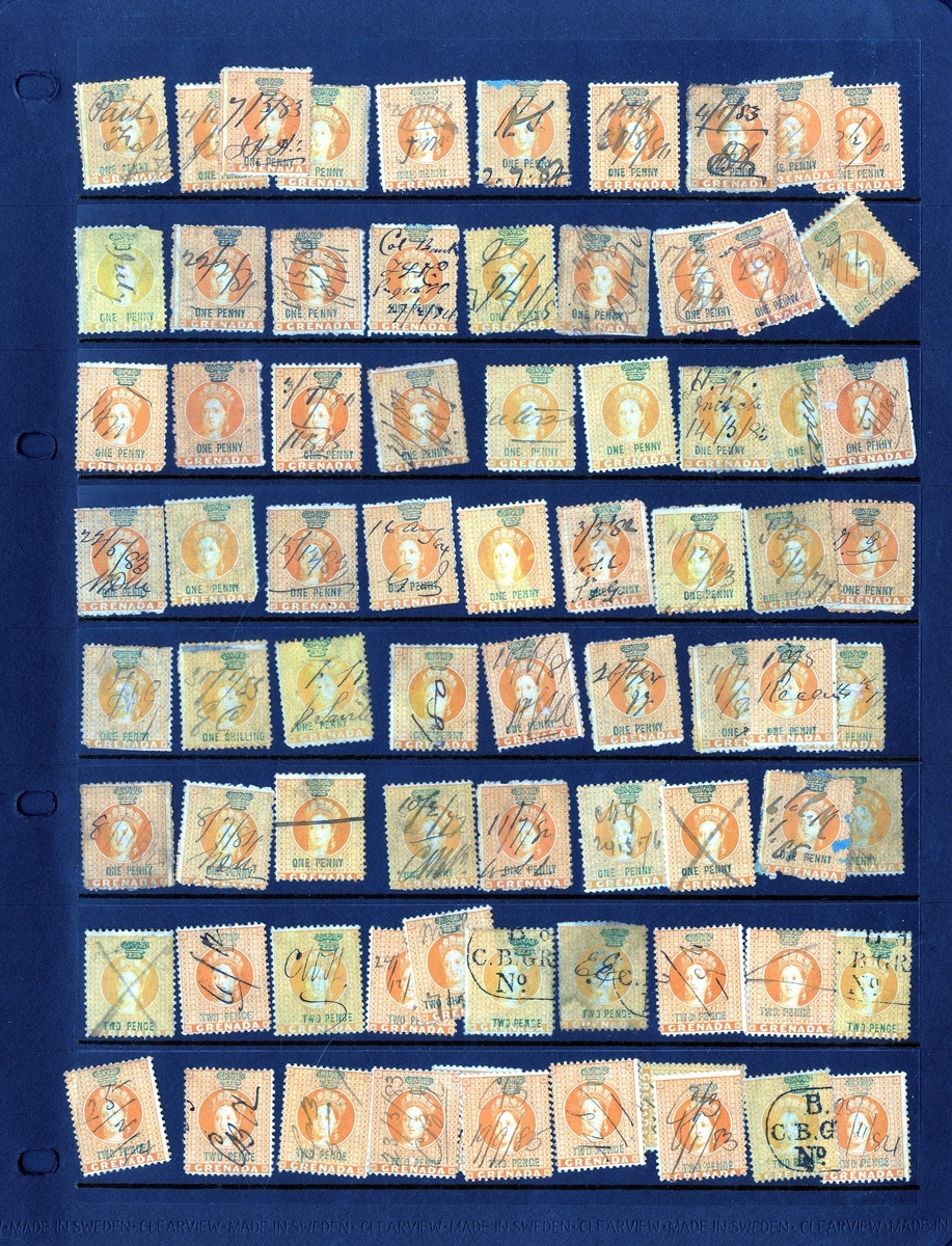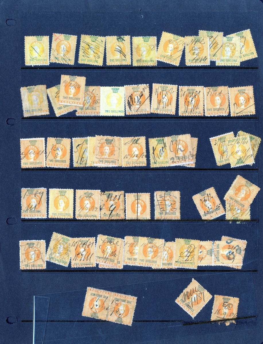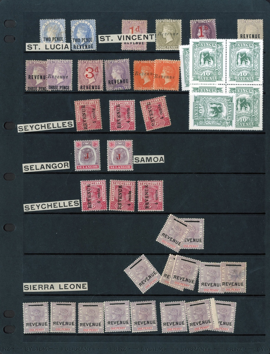 Collection on stock sheets with fine ranges of St Vincent including 3d. bisects (4 halves), and 1881-3 values to 1/- 1884-97 selection to 5/-, Grenada duplicated selection to 5/- values including Perkins Bacon issues (220+) to 5/-, St Lucia fine range of revenue overprints (30), Leeward Islands Fees values to 2/- including 1/- value used in Montserrat. Messy in places though a good sort sure to reward.