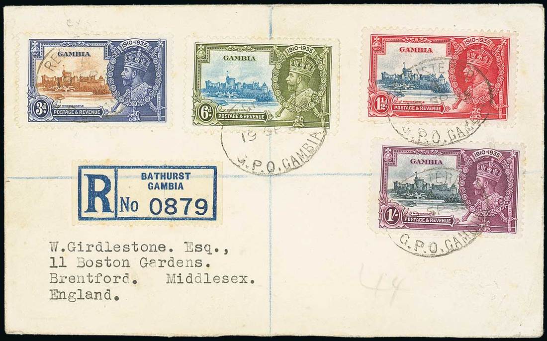 1935 (19 Sept.) envelope registered from Bathurst to Brentford bearing a set of four, 2d. brown and deep blue extra flagstaff, each neatly cancelled with registered oval datestamp; scarce. S.G. 144a, £275+. Photo