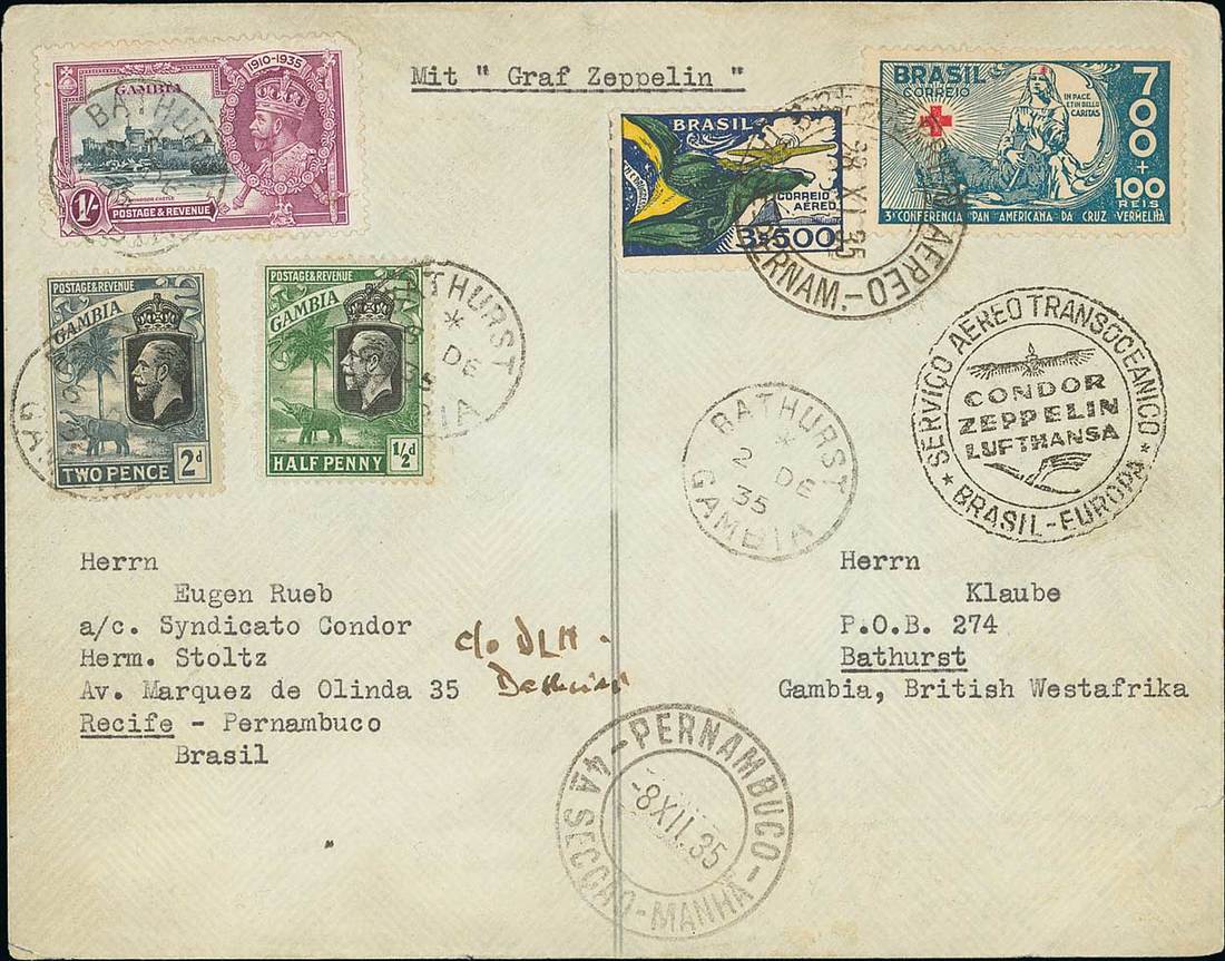 1935 (28 Nov.) Zeppelin flight envelope from Pernambuco to Bathurst, bearing Brazil 700r. and $3,500 sharing double-ring datestamp and flown on the last of three pendulum flights made by the Graf Zeppelin showing "condor/zeppelin/lufthansa" illustrated cachet and with arrival datestamp (2.12) below, posted back from Bathurst to Pernambuco on the first flight of the resumed Lufthansa service with ½d., 2d. and Silver Jubilee 1/- slate and purple tied by 6 December datestamps and with arrival datestamp (8.12). Rare with just three covers recorded carried on the Zeppelin and resumed Lufthansa services. Photo