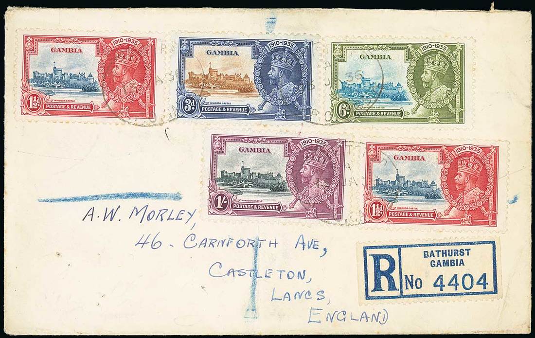 1935 (19 Dec.) envelope registered from Bathurst to Surrey bearing a set of four, 3d. brown and deep blue short extra flagstaff, all neatly cancelled by oval registered datestamps; very fine. S.G. 144b, £325+. Photo