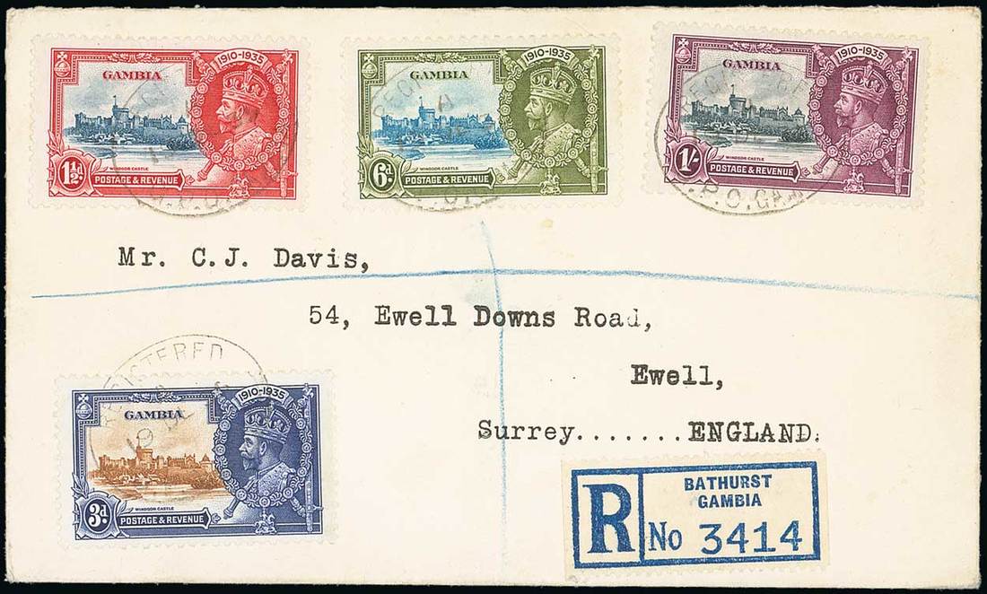 1936 (13 Jan.) envelope registered from Bathurst to Castleton, Lancs. bearing a set of four, 3d. brown and deep blue short extra flagstaff and diagonal light blue line across sky, lightly cancelled with oval registered datestamps. Scarce. S.G. 144b, £325+. Photo