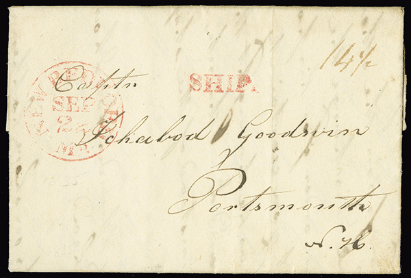 Whaling Ship "Pocahontas" at Tahihi, stampless folded letter, datelined "Pocahontas, Huahine, April 15, 1835", with interesting contents written by Captain Barnard, telling of sickness among the natives of the Society Islands, rated 14&1/2 in manuscript, handstamped SHIP in red and bearing red "New Beford Ms. Sep 22" c.d.s., addressed to Ichabod Goodwin at Portsmouth, very fine.