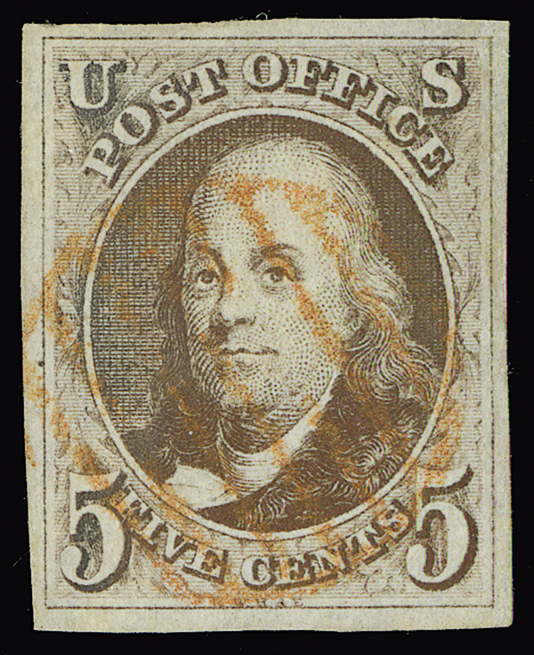#1, 5c Red brown, four large even margins, rich color, used with red circular grid cancel, very fine.