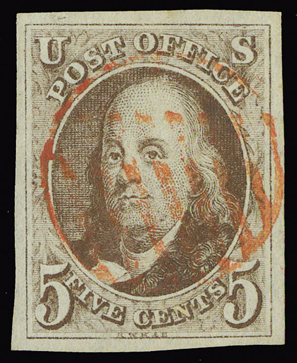 #1, 5c Red brown, large to full margins, postmarked with centrally-struck circular grid cancel in red, crisp impression, very fine.