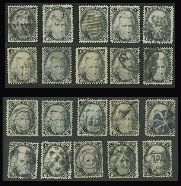 #73, 2c Black, used group of twenty, lovely range of postmarks including intaglio corks and colored cancels, a useful study lot with many pleasing examples, a few with short perfs or small faults, chiefly fine-very fine.