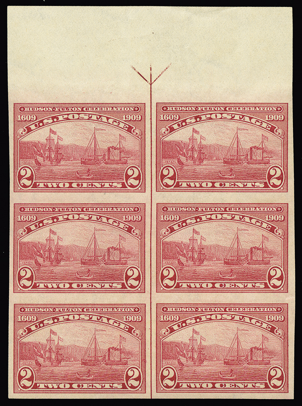 #372, 2c Hudson-Fulton Imperforate, upper margin block of six showing vertical guideline, never hinged, trivial diagonal gum bend, attractive and very fine.