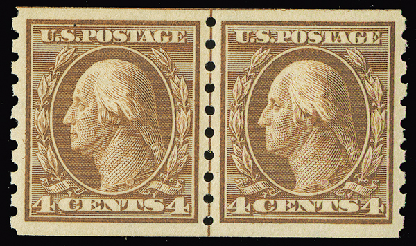 #395, 4c Brown coil guide line pair, hinged, rich warm shade, superior centering, extremely fine, with 2019 P.S.E certificate (XF90, SMQ $495)