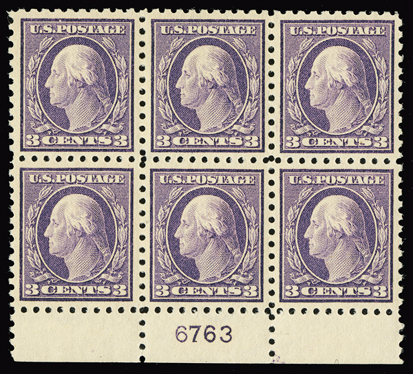 #426, 3c Deep violet, plate block of six, lightly hinged on one stamp only, deep color and exceptional centering, very fine.
