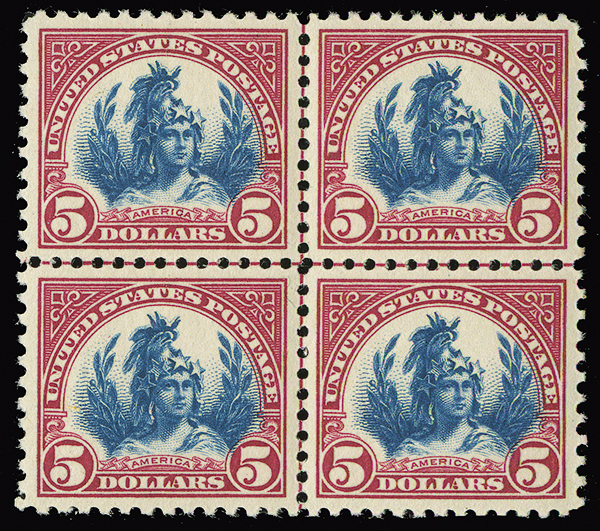 #573a, $5.00 Carmine lake and dark blue, center line block of four, exceptionally well-centered, bright post-office fresh color, a lovely block with tremendous visual appeal, likely one of the nicest examples extant, with 2019 P.S.E. certificate (XF-Sup 95, SMQ unpriced)