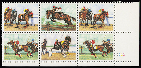 #2759b, 29c Sporting Horses engraving omitted variety, a visually striking lower right corner block of six, pristine never hinged original gum, an appealing modern error, very fine.