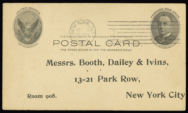 #UX17, 1c Black, "Full Face" McKinley, postmarked with "New York N.Y. Oct 8 1902" machine cancel, printed address of Messrs. Booth, Dailey & Ivins, trivial edge wear, a lovely example of this scarce card, very fine, with 1976 P.F. certificate.