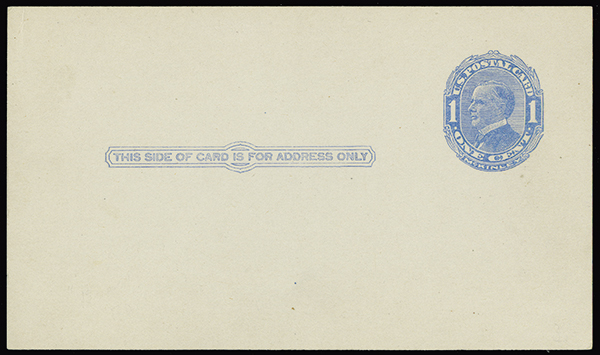 #UX21e, 1c Blue on bluish, Type II, showing the break in top arc and small white dot above bottom serifs of left "1", a superb mint example of this scarce card, very fine. (UPSS S28f-2)