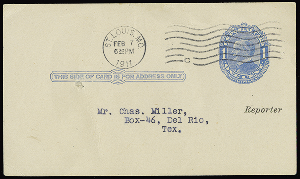 #UX21e, 1c Blue on bluish, with four arcs above and below "IS" pointed, Type I, with the top arc broken but blunt, postmarked "St Louis MO Feb 7 1911", a sound used example, very fine. (UPSS #S28f-1)