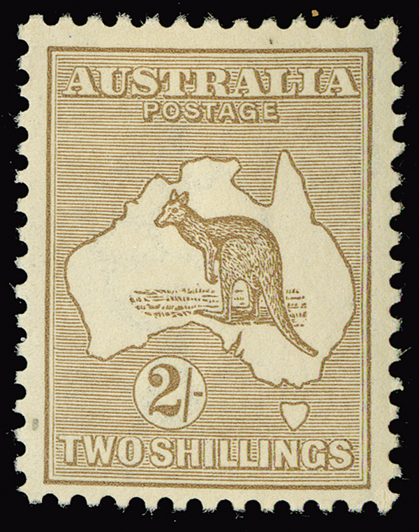 #43, 1915 2/- Brown Kangaroo, small hinge remnant, well-centered, fresh color, very fine. (S.G. #29, £1,000)