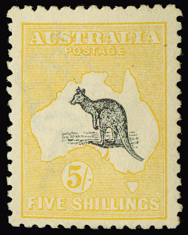 #44, 1915 5/- Yellow and grey Kangaroo, hinged, impressive bright color and detailed impression, centered a little towards the bottom, a difficult stamp, fine-very fine. (S.G. #30, £1,000)