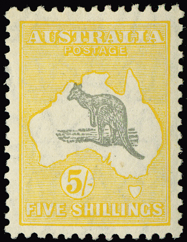 #100, 1929 5/- Yellow and grey Kangaroo, pristine never hinged original gum, beautiful bright color, choice centering, a superb stamp, very fine. (S.G. #111)
