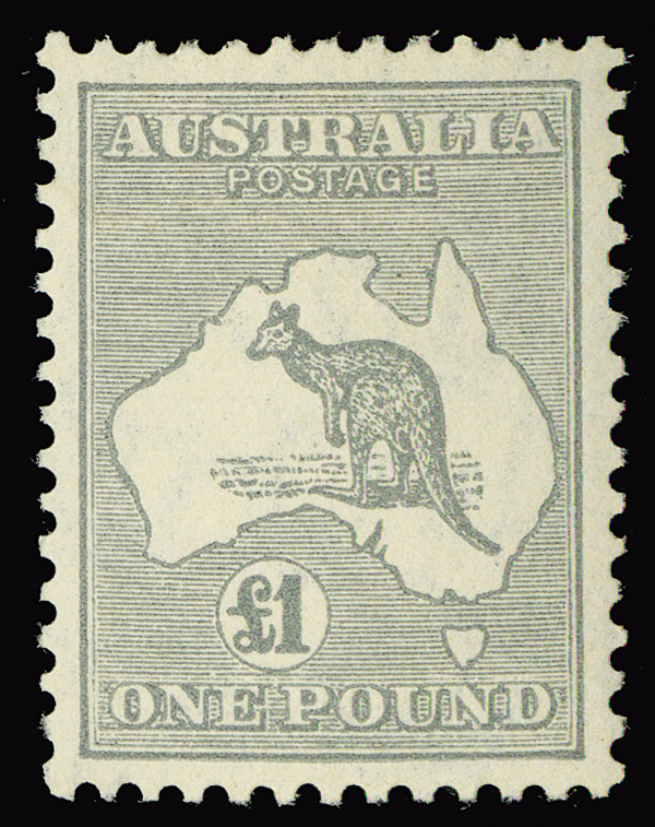 #128, 1935 £1 Grey Kangaroo, superior centering, post-office fresh color, hinged, a lovely example, very fine. (S.G. #137, £650)
