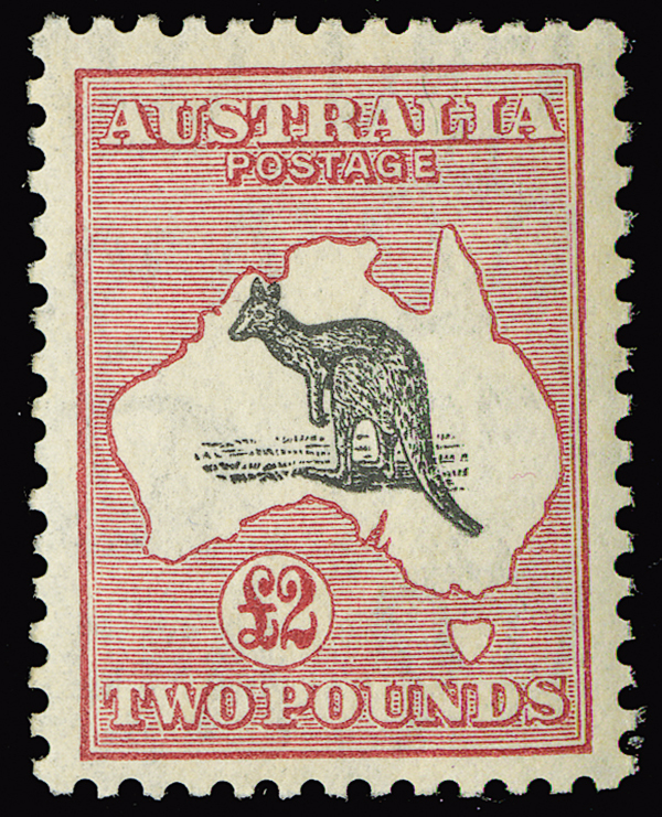 #129, 1934 £2 Dull rose & black Kangaroo, multiple C of A watermark, gorgeous bright color, immaculate centering, lightly hinged original gum, an exceptional example of this scarce stamp, very fine. (S.G. #138, £4,250)