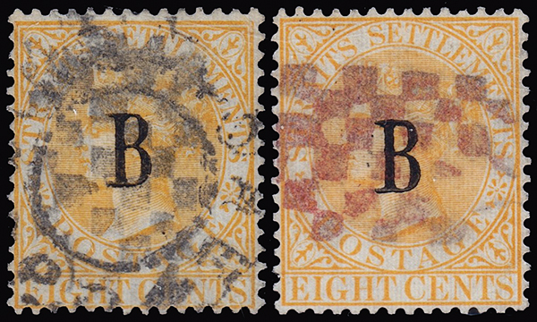 1882-5 Useful used group of eight, includes 1882 issues cancelled British Consulate Bangkok 2c brown (fault at upper left) and 8c orange-yellow (surface scuff), 1882-5 watermark Crown CC 8c orange of the Straits Settlements used with United States Consulate handstamp and 24c green with Bangkok c.d.s., watermark Crown CA 2c pale rose showing ink transfer from stacking sheets, with ghostly inverted "B" overprint, three 8c orange examples including one with United States Legation handstamp, an interesting group, chiefly fine.