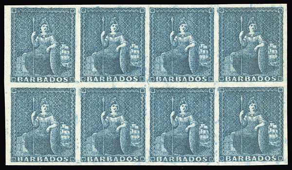 #2, 1852 1d Dark blue on blued paper, block of eight, hinged between the two top middle stamps, the other six being never hinged, lovely deep color, full margins, a beautiful block, scarce and very fine. (S.G. #4, £308+ as singles)
