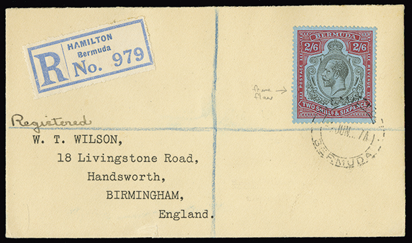 #95, 1927 2/6d Red & black on blue with "broken frame flaw," tied to registered cover by Hamilton c.d.s., to Birmingham, England, with oval 23 JU 27 arrival backstamp, very fine.