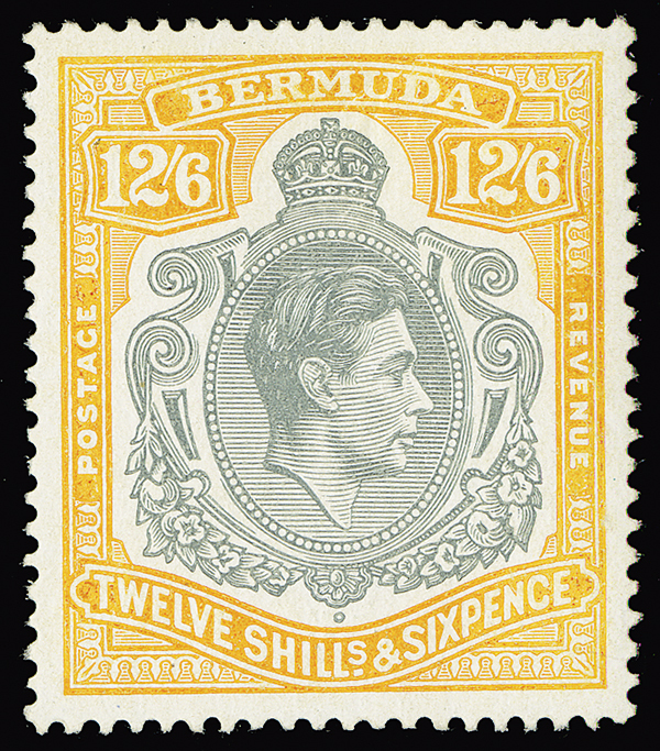 #127var, 1938-53 12/6d Grey and yellow, on ordinary paper, distinctive "lemon yellow" color, lightly hinged, outstanding centering, a choice example of this rare shade, very fine (SG #120d, £700)