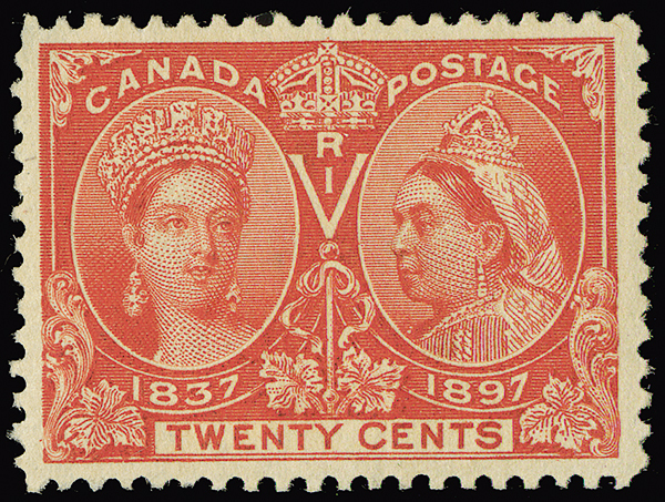 #59, 1897 20c Vermilion Diamond Jubilee, striking bright color, hinge remnant, very fine. (Unitrade C$400)