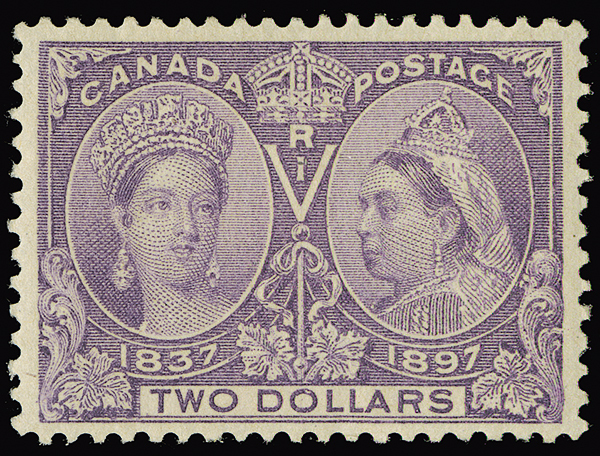 #62, 1897 $2.00 Dark purple Diamond Jubilee, pleasing dark shade, fresh paper, hinge remnant, an attractive stamp, very fine. (Unitrade C$2,000)